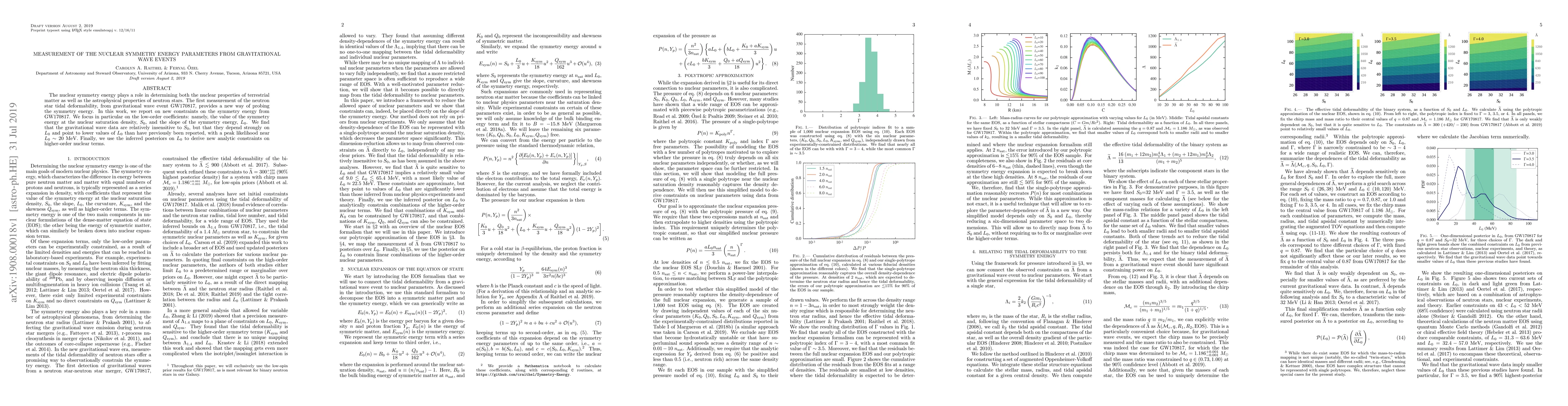 This paper measures nuclear symmetry energy parameters from gravitational wave data of event GW170817, finding that while the data is insensitive to the symmetry energy value at saturation density, it strongly influences the symmetry energy slope, suggesting lower values than previously reported, around L_0 ~ 20 MeV.
