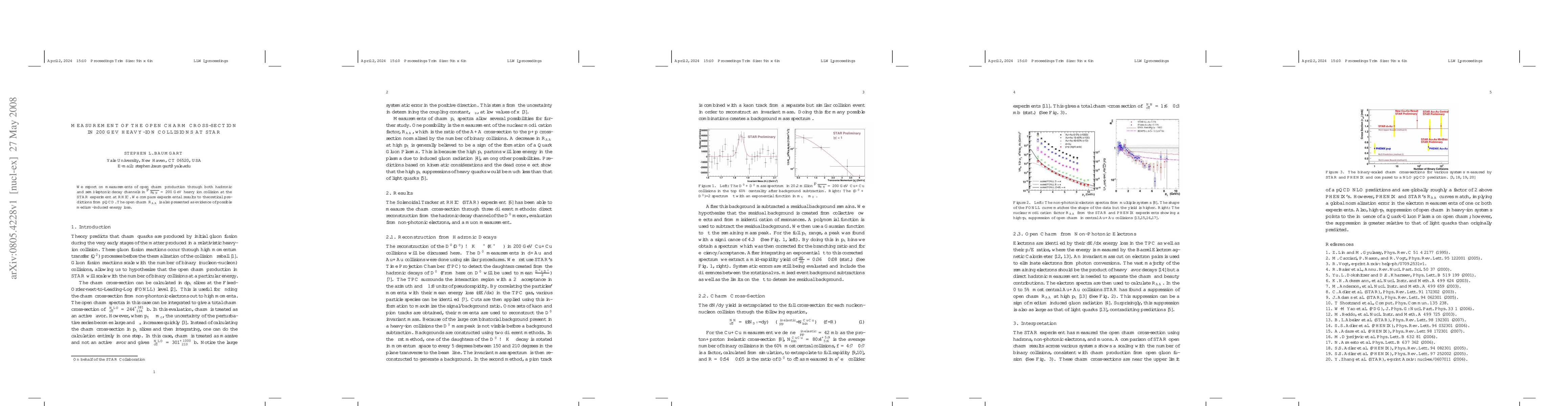 The paper presents measurements of open charm production in 200 GeV heavy ion collisions at STAR, comparing results with pQCD predictions. It also reports open charm $R_{AA}$ as evidence of potential medium-induced energy loss.