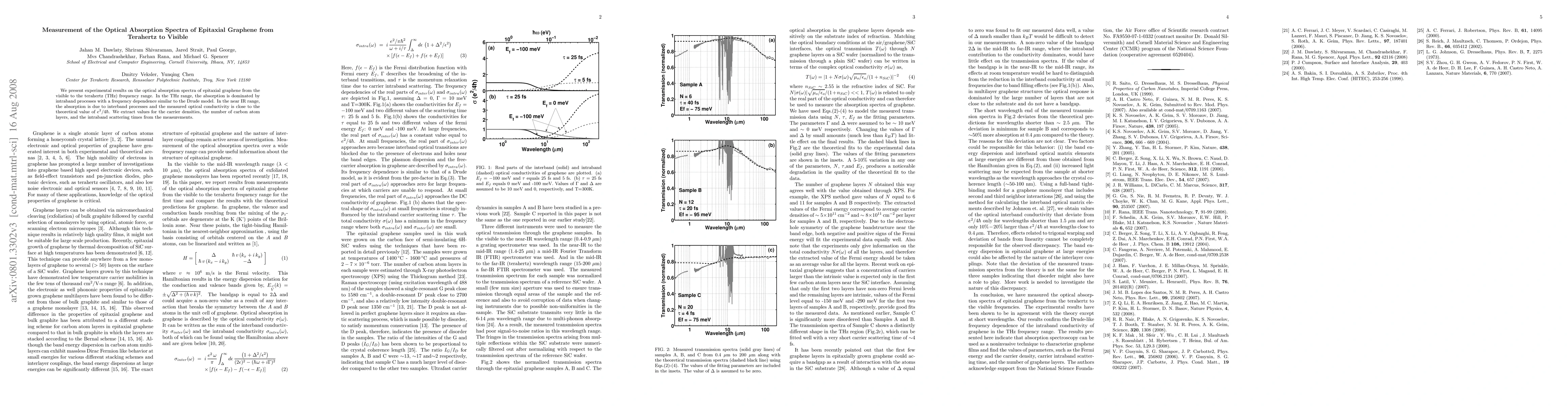 This study measures the optical absorption spectra of epitaxial graphene from terahertz to visible frequencies, finding that intraband processes dominate in the THz range and interband processes in the near IR, with optical conductivity close to theoretical predictions. Extracted values include carrier densities, carbon layers, and intraband scattering times.