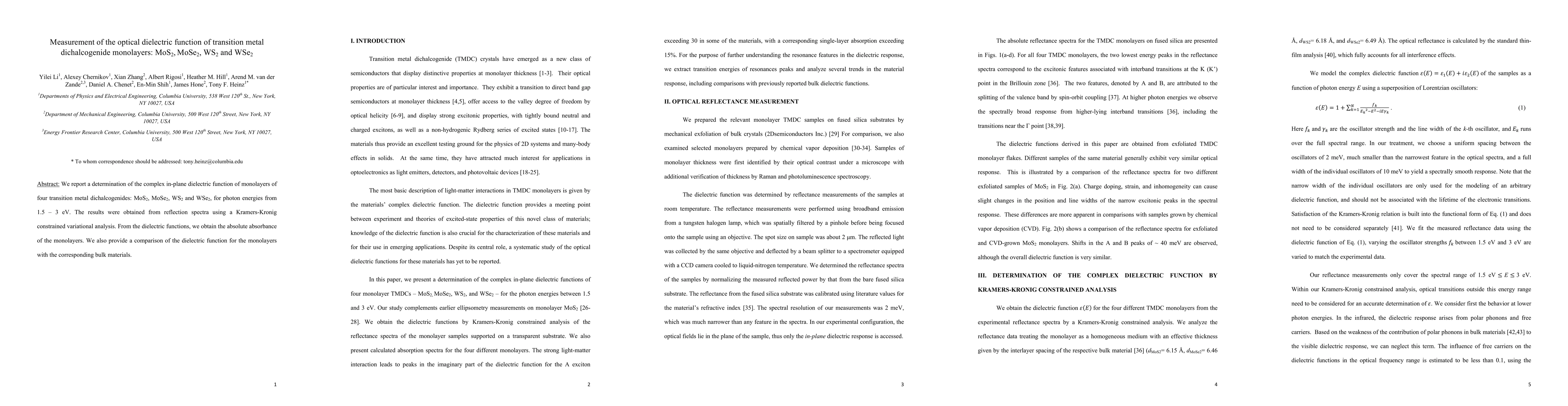 This study measures the complex in-plane dielectric function of MoS2, MoSe2, WS2, and WSe2 monolayers using reflection spectra and Kramers-Kronig analysis, revealing their optical properties from 1.5 to 3 eV. The research also compares these monolayers' dielectric functions with their bulk counterparts.