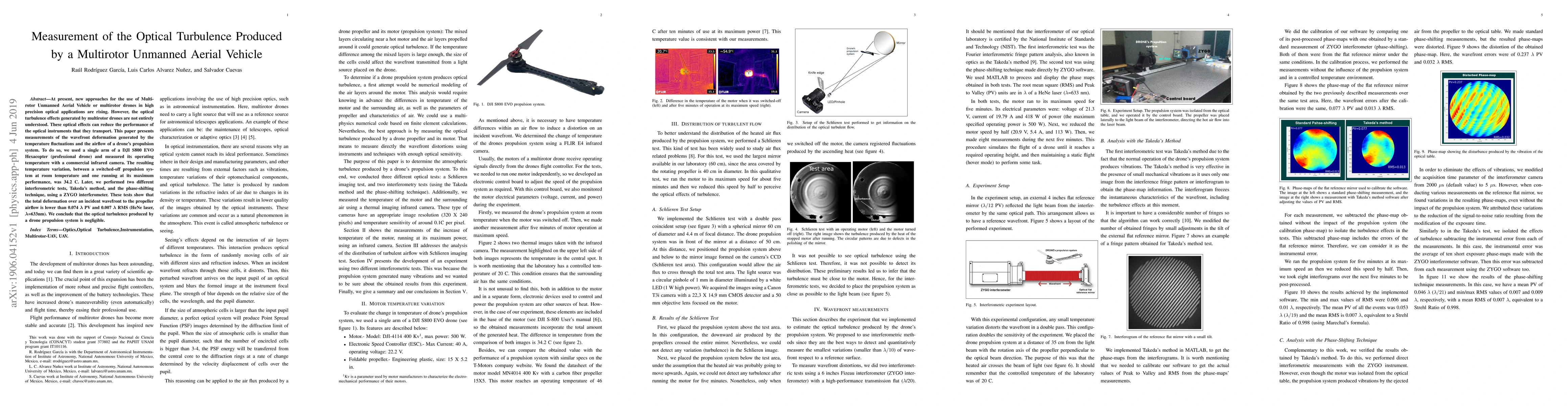 At present, new approaches for the use of Multirotor Unmanned Aerial Vehicle or multirotor drones in high precision optical applications are rising. However, the optical turbulence effects generated by multirotor drones are not entirely understood. These optical effects can reduce the performance of the optical instruments that they transport. This paper presents measurements of the wavefront deformation generated by the temperature fluctuations and the airflow of a drone's propulsion system. To do so, we used a single arm of a DJI S800 EVO Hexacopter (professional drone) and measured its operating temperature with a commercial infrared camera. The resulting temperature variation, between a switched-off propulsion system at room temperature and one running at its maximum performance, was 34.2{\deg} C. Later, we performed two different interferometric tests, Takeda's method, and the phase-shifting technique, using a ZYGO interferometer. These tests show that the total deformation over an incident wavefront to the propeller airflow is lower than 0.074 \lambda PV and 0.007 \lambda RMS (HeNe laser, \lambda=633nm). We conclude that the optical turbulence produced by a drone propulsion system is negligible.