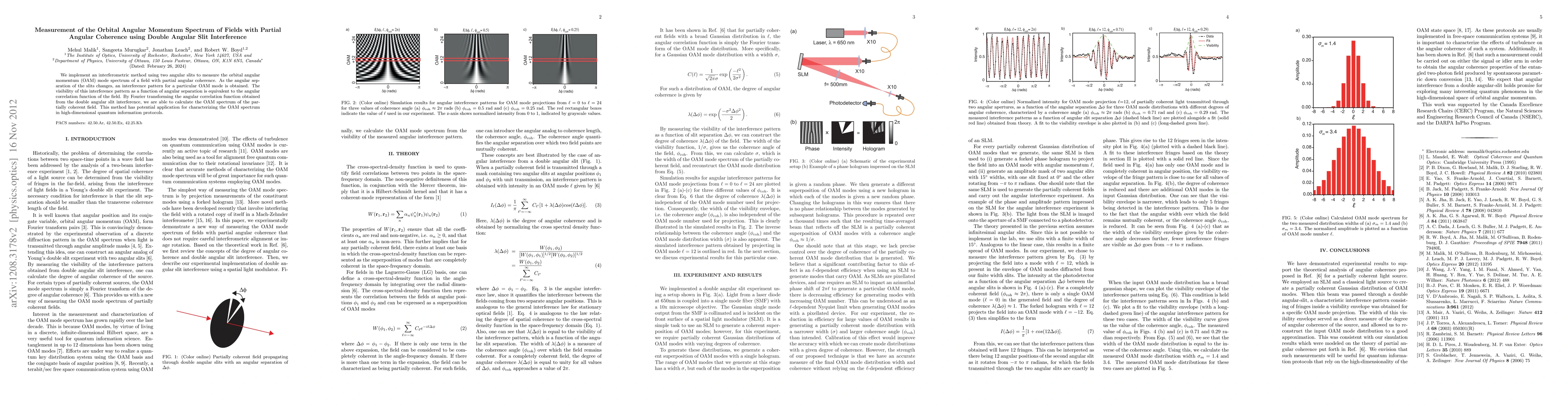 This paper presents an interferometric method using double angular slits to measure the orbital angular momentum mode spectrum of partially coherent fields. The method correlates angular separation with interference pattern visibility to determine the OAM spectrum, with potential applications in high-dimensional quantum information protocols.