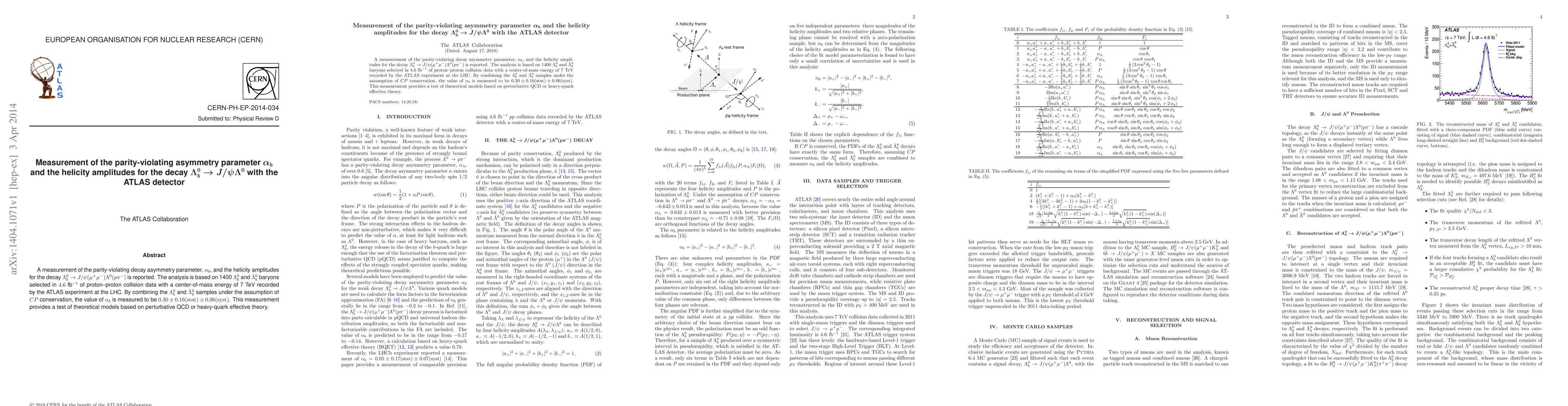 A measurement of the parity-violating decay asymmetry parameter, alpha_b, and the helicity amplitudes for the decay Lambda_b->J/psi(mu mu)+Lambda(p pi) is reported. The analysis is based on 1400 Lambda_b and anti-Lambda_b baryons selected in 4.6/fb of proton-proton collision data with a center-of-mass energy of 7 TeV recorded by the ATLAS experiment at the LHC. By combining the Lambda_b and anti-Lambda_b samples under the assumption of CP conservation, the value of alpha_b is measured to be 0.30+/-0.16(stat)+/-0.06(syst). This measurement provides a test of theoretical models based on perturbative QCD or heavy-quark effective theory.