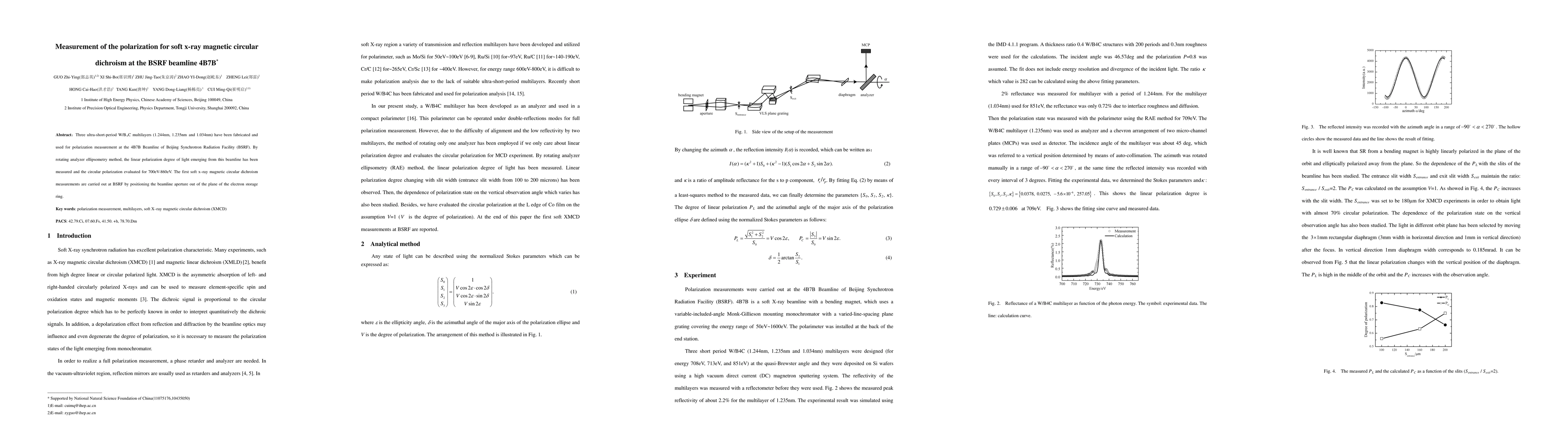 Three ultra-short-period W/B4C multilayers (1.244nm, 1.235nm and 1.034nm) have been fabricated and used for polarization measurement at the 4B7B Beamline of Beijing Synchrotron Radiation Facility (BSRF). By rotating analyzer ellipsometry method, the linear polarization degree of light emerging from this beamline has been measured and the circular polarization evaluated for 700eV-860eV. The first soft x-ray magnetic circular dichroism measurements are carried out at BSRF by positioning the beamline aperture out of the plane of the electron storage ring.