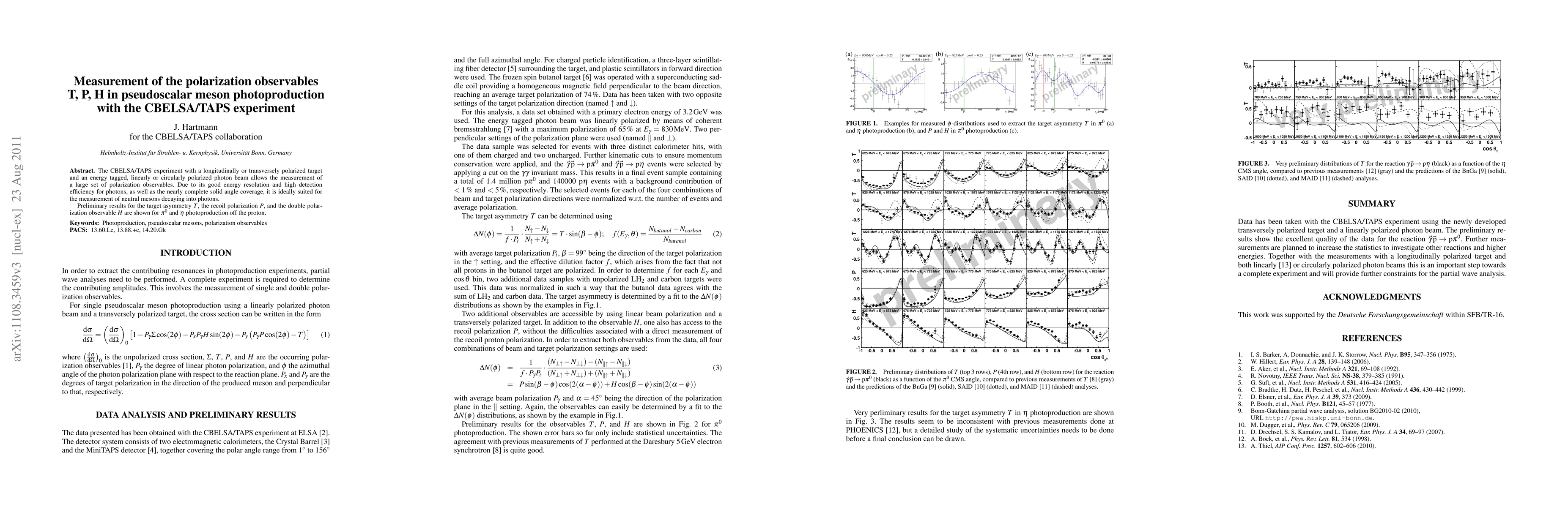 This paper reports on measurements of polarization observables T, P, and H in the photoproduction of pseudoscalar mesons (\pi^0 and \eta) using the CBELSA/TAPS experiment, which employs polarized targets and photon beams. Preliminary results for these observables are presented, showcasing the experiment's high resolution and efficiency.