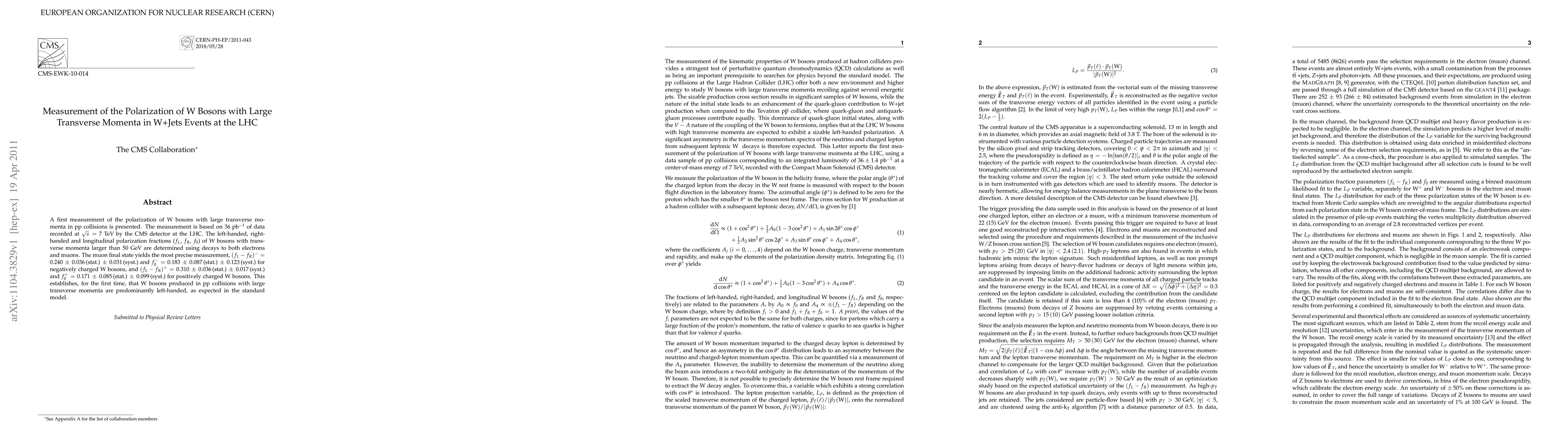 Researchers at CMS detector measure W boson polarization in pp collisions with large transverse momenta, confirming they are predominantly left-handed as expected in the Standard Model.