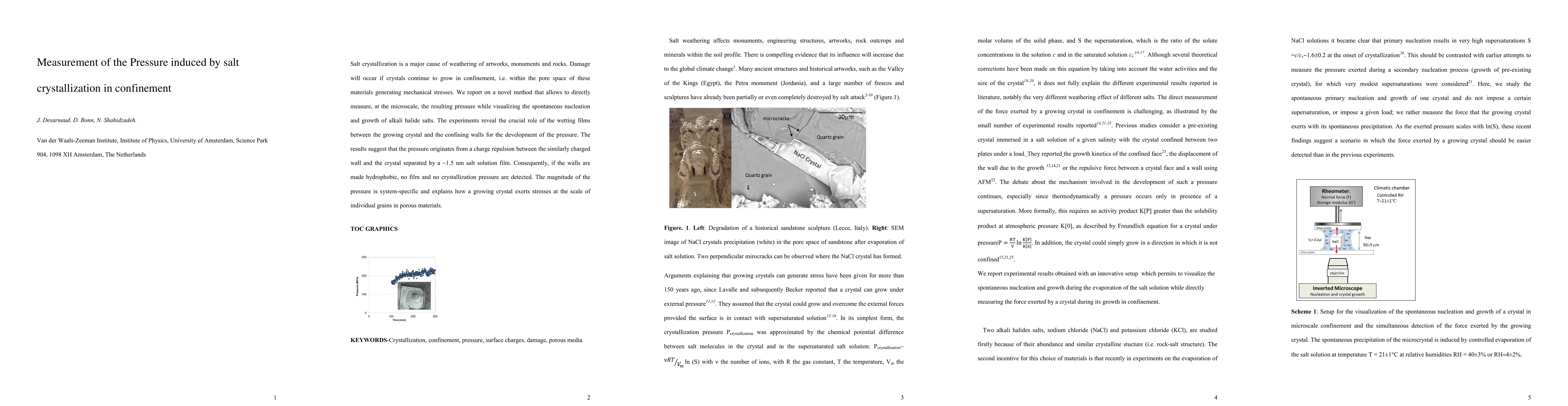 This paper presents a novel method to measure the pressure induced by salt crystallization at the microscale, revealing the role of wetting films in generating mechanical stresses. The study finds that the pressure originates from charge repulsion between the crystal and confining walls, and hydrophobic walls prevent this pressure by eliminating the wetting film.