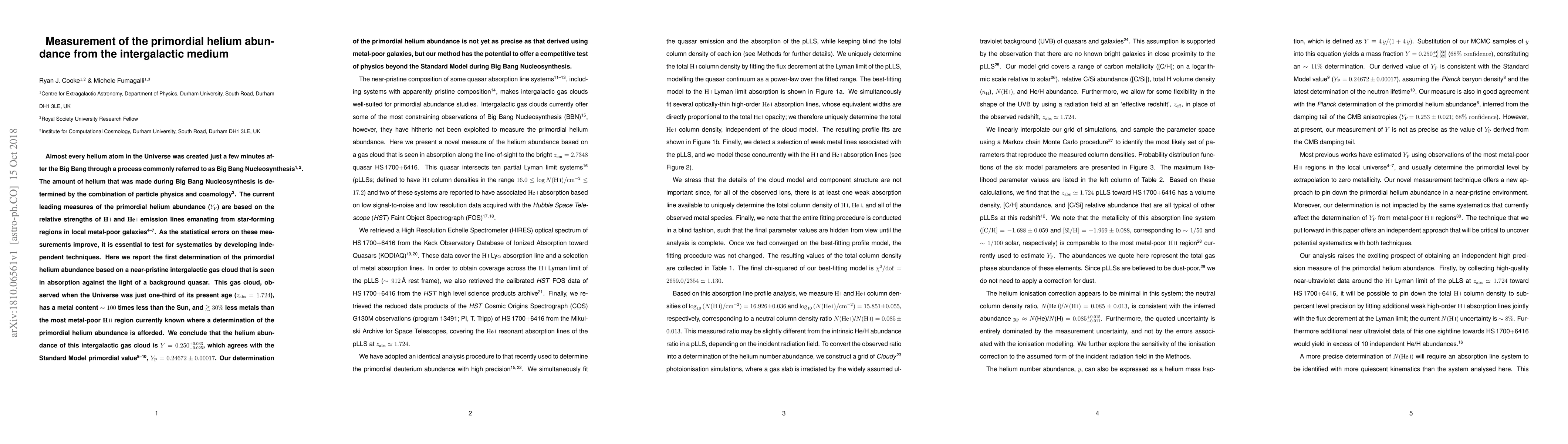 This paper reports the first measurement of primordial helium abundance (Y_P) from a near-pristine intergalactic gas cloud observed in absorption against a quasar, yielding Y = 0.250^{+0.033}_{-0.025}. This method provides an independent test of the Standard Model value of Y_P = 0.24672 +/- 0.00017, potentially offering insights into physics beyond the Standard Model.