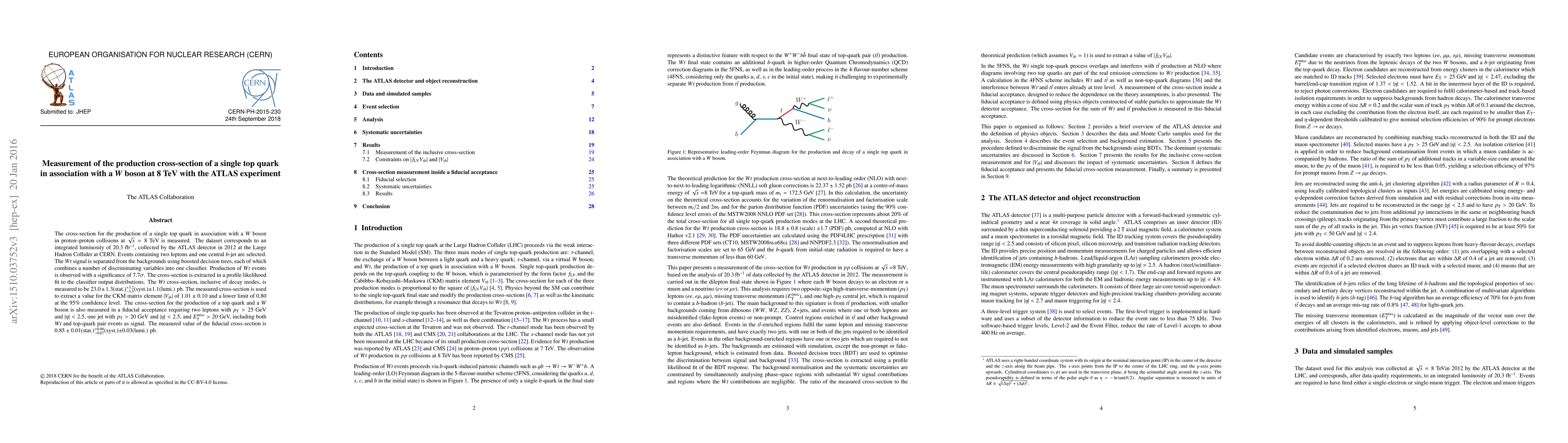 Researchers at ATLAS have measured the production cross-section of a single top quark in association with a W boson in proton-proton collisions, yielding a significance of 7.7 sigma and a cross-section of 23.0 pb.
