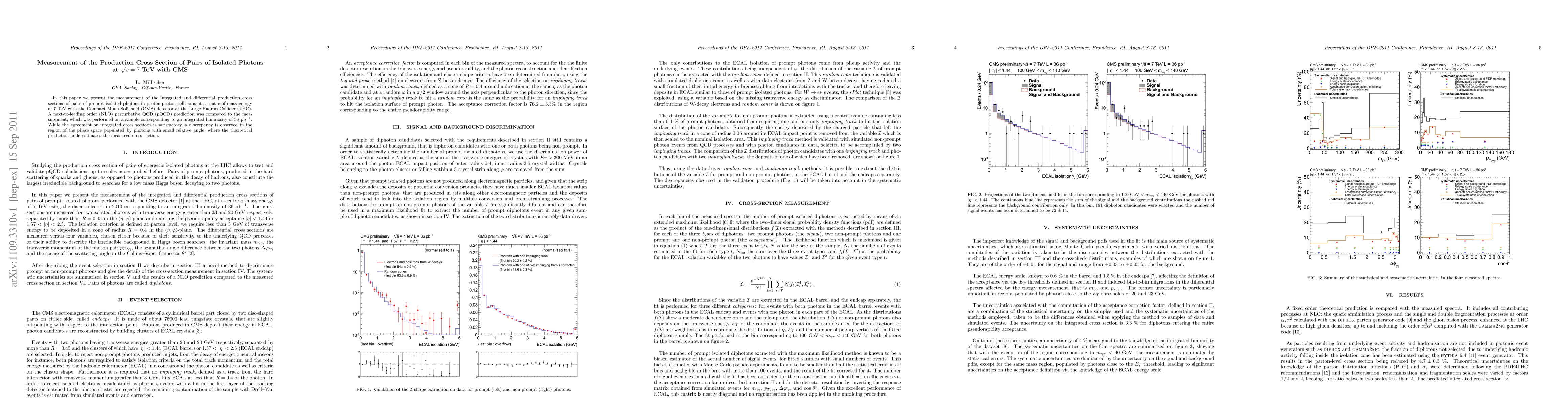In this paper we present the measurement of the integrated and differential production cross sections of pairs of prompt isolated photons in proton-proton collisions at a centre-of-mass energy of 7 TeV with the Compact Muon Sollenoid (CMS) detector at the Large Hadron Collider (LHC). A next-to-leading order (NLO) perturbative QCD (pQCD) prediction was compared to the measurement, which was performed on a sample corresponding to an integrated luminosity of 36 inverse picobarn. While the agreement on integrated cross sections is satisfactory, a discrepancy is observed in the region of the phase space populated by photons with small relative angle, where the theoretical prediction underestimates the measured cross section.