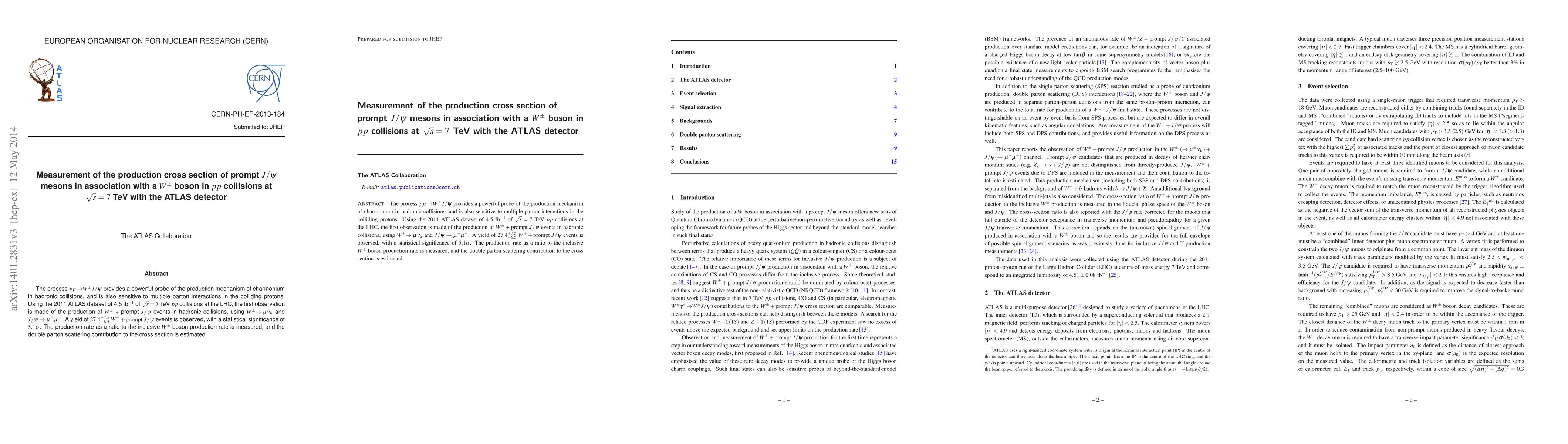 The ATLAS experiment observed the first production of W + prompt J/psi mesons in pp collisions at 7 TeV, providing insights into charmonium production and multiple parton interactions, with a statistical significance of 5.1 sigma. The production rate ratio and double parton scattering contribution were also estimated.