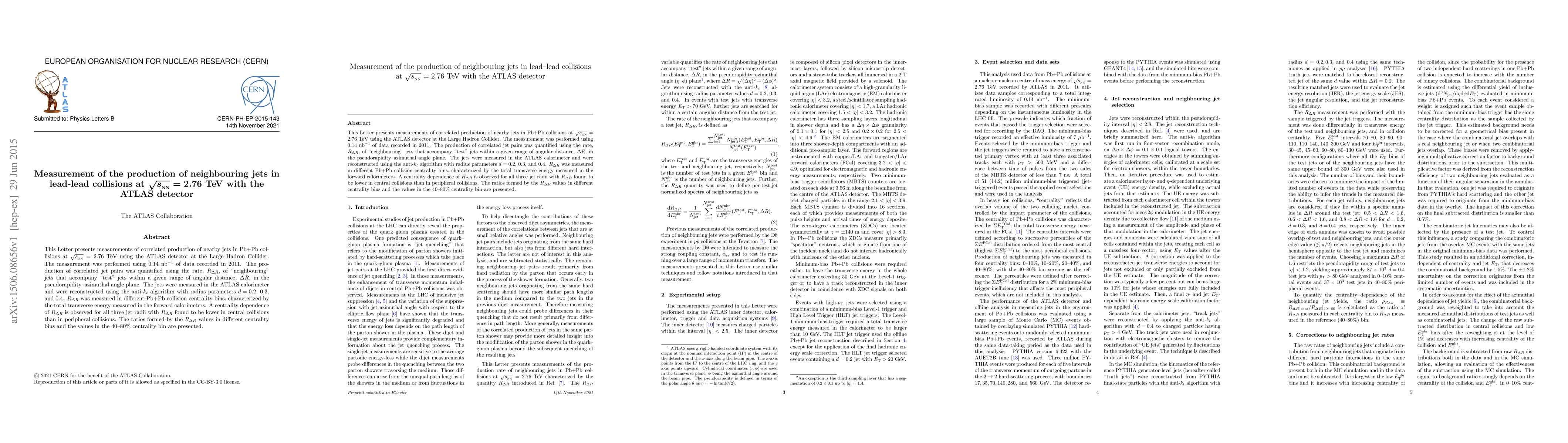This paper reports on measurements of correlated production of nearby jets in lead-lead collisions at $\sqrt{s_{\mathrm{NN}}} = 2.76$ TeV using the ATLAS detector, revealing a centrality dependence in the rate of "neighbouring" jets accompanying "test" jets. The study found lower rates in central collisions compared to peripheral ones.