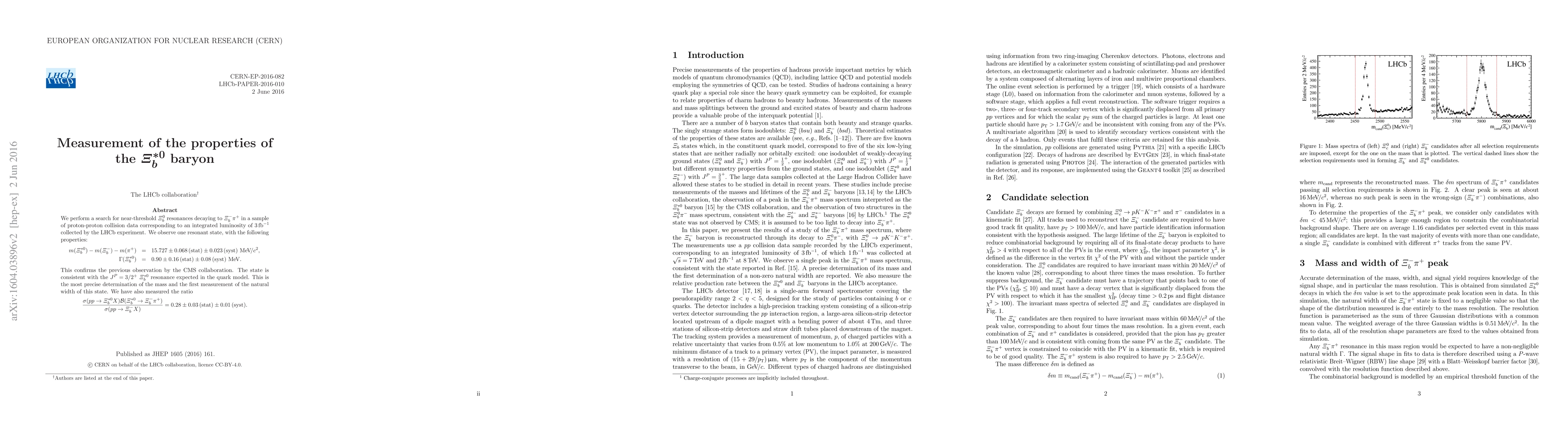 We perform a search for near-threshold $\Xi_b^0$ resonances decaying to $\Xi_b^- \pi^+$ in a sample of proton-proton collision data corresponding to an integrated luminosity of 3 fb$^{-1}$ collected by the LHCb experiment. We observe one resonant state, with the following properties: \begin{eqnarray*} m(\Xi_b^{*0}) - m(\Xi_b^-) - m(\pi^+) &=& 15.727 \pm 0.068 \, (\mathrm{stat}) \pm 0.023 \, (\mathrm{syst}) \, \mathrm{MeV}/c^2, \Gamma(\Xi_b^{*0}) &=& 0.90 \pm 0.16 \, (\mathrm{stat}) \pm 0.08 \, (\mathrm{syst}) \, \mathrm{MeV} . \end{eqnarray*} This confirms the previous observation by the CMS collaboration. The state is consistent with the $J^P=3/2^+$ $\Xi_b^{*0}$ resonance expected in the quark model. This is the most precise determination of the mass and the first measurement of the natural width of this state. We have also measured the ratio \begin{align*} \frac{\sigma(pp \to \Xi_b^{*0} X){\cal{B}}(\Xi_b^{*0} \to \Xi_b^- \pi^+)}{\sigma(pp \to \Xi_b^- X)} = 0.28 \pm 0.03 \, (\mathrm{stat}) \pm 0.01 \, (\mathrm{syst}) . \end{align*}