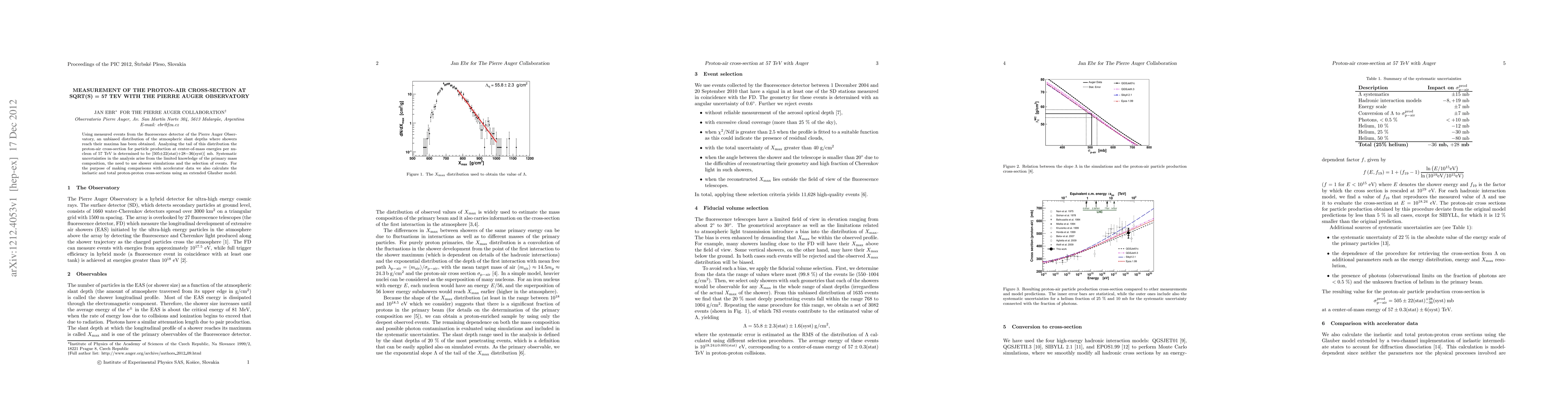 Using measured events from the fluorescence detector of the Pierre Auger Observatory, an unbiased distribution of the atmospheric slant depths where showers reach their maxima has been obtained. Analyzing the tail of this distribution the proton-air cross-section for particle production at center-of-mass energies per nucleon of 57 TeV is determined to be [505$\pm$22(stat)+28$-$36(syst)] mb. Systematic uncertainties in the analysis arise from the limited knowledge of the primary mass composition, the need to use shower simulations and the selection of events. For the purpose of making comparisons with accelerator data we also calculate the inelastic and total proton-proton cross-sections using an extended Glauber model.