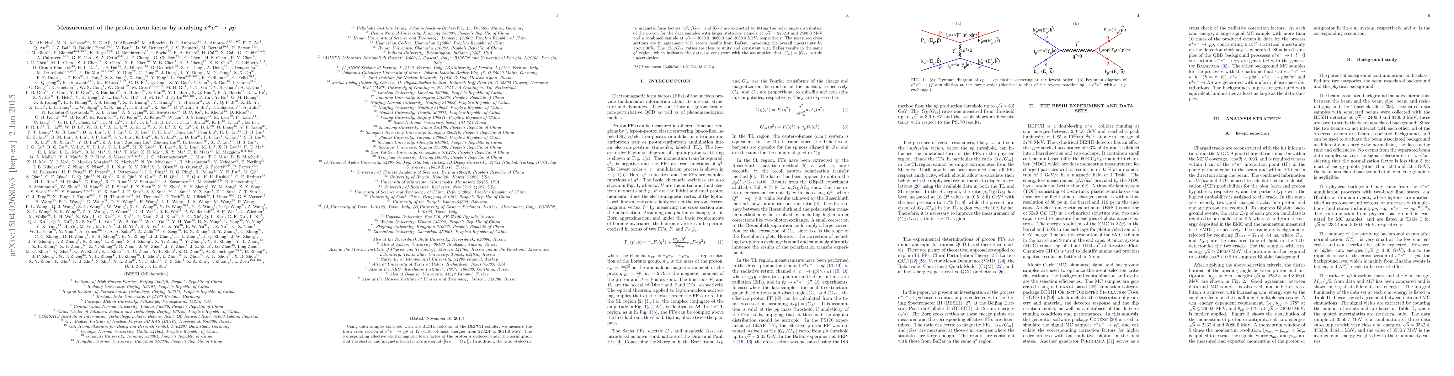 This paper measures the proton form factor by studying $e^{+}e^{-}\rightarrow p\bar{p}$ using BESIII detector data, finding the effective electromagnetic form factor and extracting $|G_{E}/G_{M}|$ ratios, which are consistent with BaBar results and support the assumption $|G_{E}|=|G_{M}|$. The results improve the overall uncertainty by 30%.