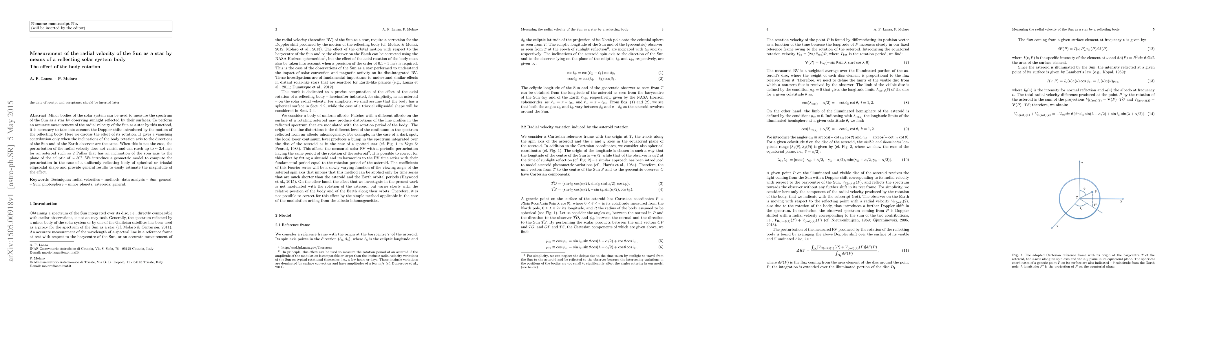 A study finds that minor solar system bodies can affect measurements of the Sun's radial velocity when used as a reflecting star, with a maximum effect of 2.4 m/s for an asteroid like 2 Pallas.