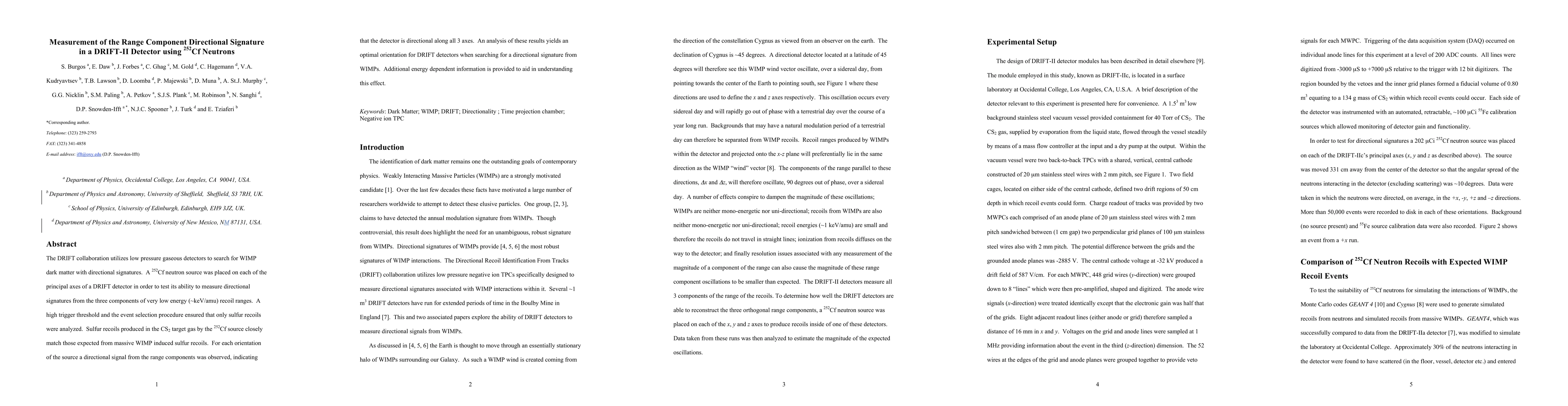 A study using a DRIFT detector found that it can measure directional signatures from WIMP dark matter candidates with optimal orientation along all three axes. The detection relied on analyzing the range component of neutron-induced sulfur recoils.