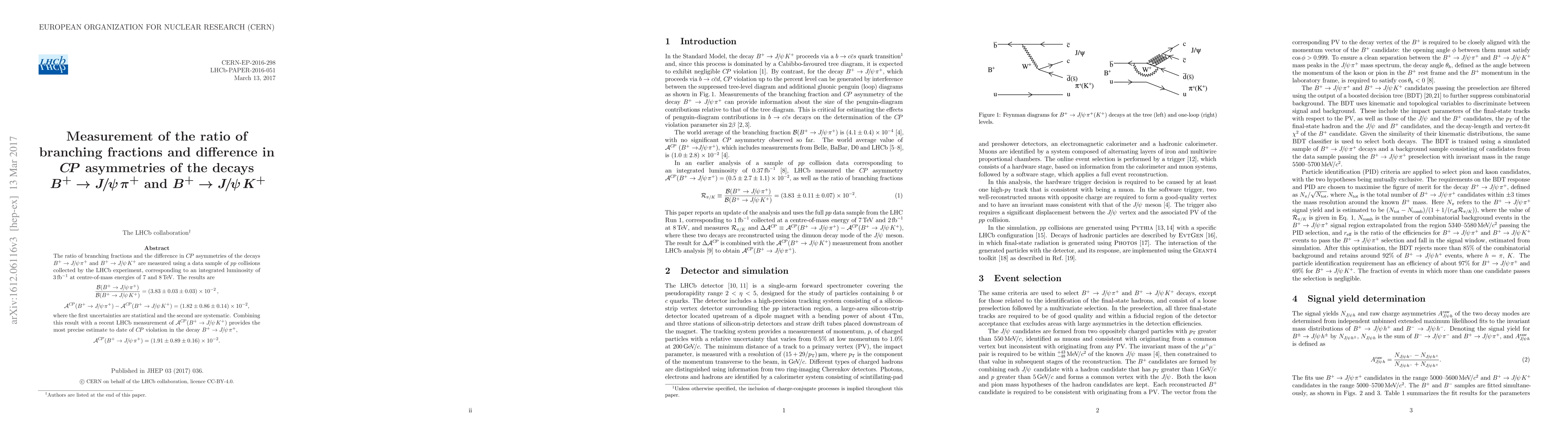 This study measures the branching fraction ratio and $CP$ asymmetry difference for $B^+\to J/\psi \pi^+$ and $B^+\to J/\psi K^+$ decays using LHCb data, finding a precise ratio and providing the most accurate $CP$ asymmetry estimate for $B^+\to J/\psi \pi^+$ to date.