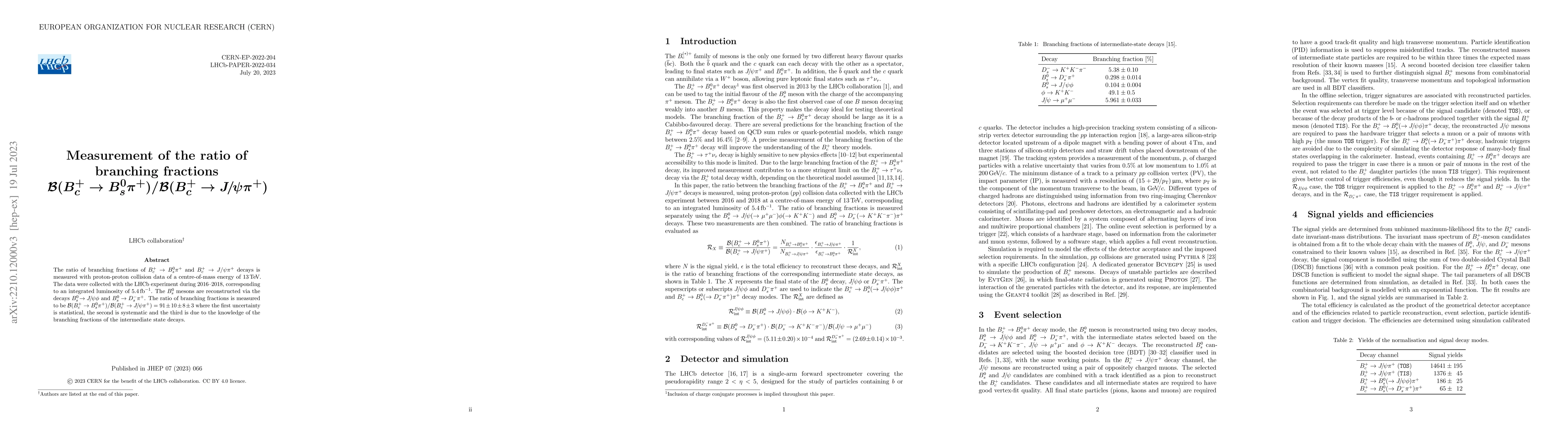 This paper measures the ratio of branching fractions for $B_c^+$ decays into $B_s^0 \pi^+$ and $J/\psi \pi^+$ using LHCb data from 2016-2018, yielding a ratio of $91 \pm 10 \pm 8 \pm 3$. The uncertainties account for statistical, systematic, and intermediate decay knowledge variations.