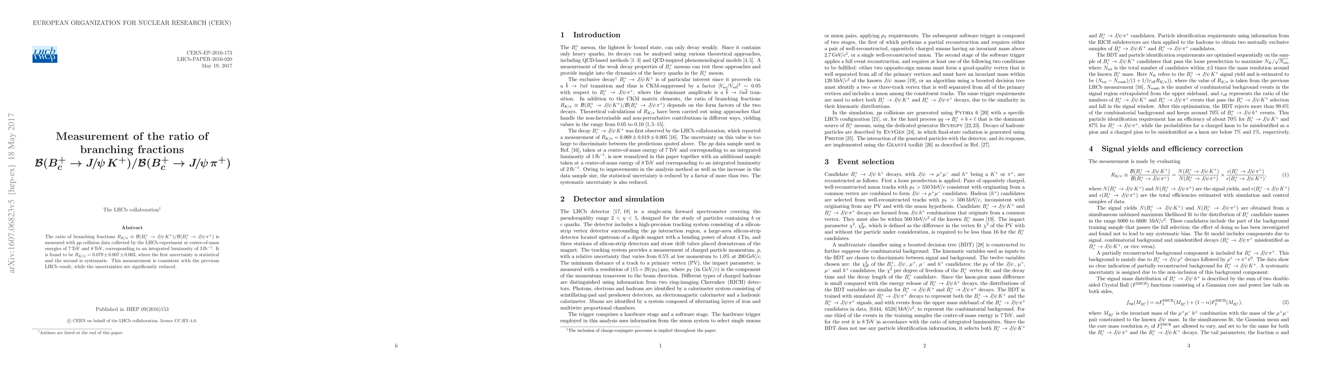 The ratio of branching fractions $R_{K/\pi} \equiv \mathcal{B}(B_{c}^{+} \to J/\psi K^{+})/\mathcal{B}(B_{c}^{+} \to J/\psi\pi^{+})$ is measured with $pp$ collision data collected by the LHCb experiment at centre-of-mass energies of 7 TeV and 8 TeV, corresponding to an integrated luminosity of 3${\mbox{fb}^{-1}}$. It is found to be $ R_{K/\pi} = 0.079\pm0.007\pm0.003$, where the first uncertainty is statistical and the second is systematic. This measurement is consistent with the previous LHCb result, while the uncertainties are significantly reduced.