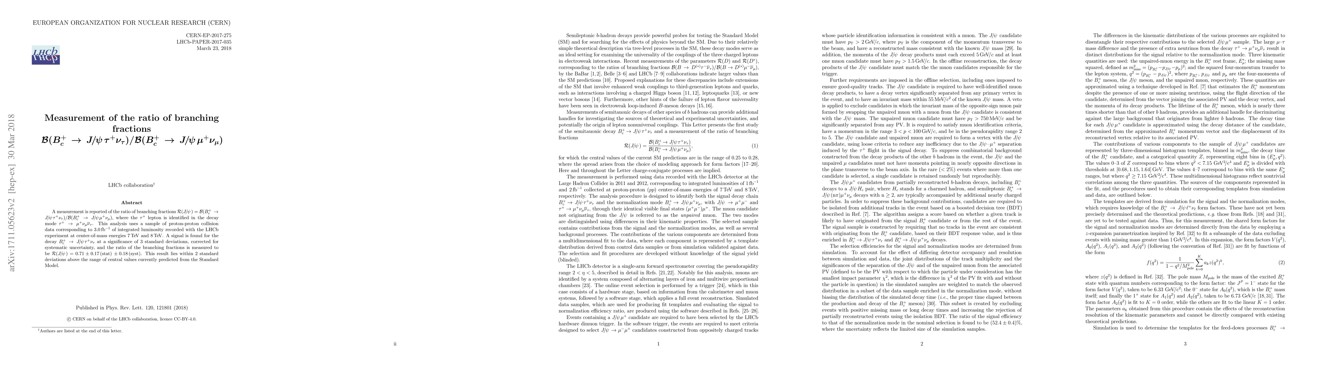 Scientists at LHCb experiment measure a branching fraction ratio for a rare decay mode of $B_c$ particles, finding a value of 0.71 with statistical and systematic uncertainties.