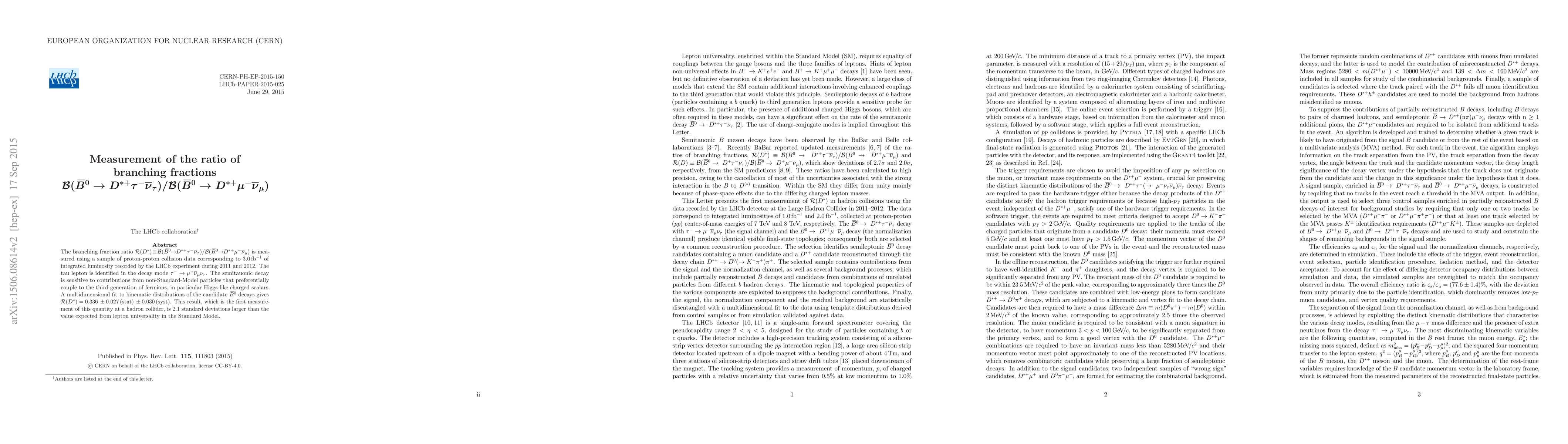 The LHCb experiment measures the ratio of branching fractions $\mathcal{R}(D^{*})$ for $\overline{B}^0$ decays into $D^{*+}\tau^{-}\overline{\nu}_{\tau}$ and $D^{*+}\mu^{-}\overline{\nu}_{\mu}$, finding $\mathcal{R}(D^{*}) = 0.336 \pm 0.027(stat) \pm 0.030 (syst)$. This result deviates from the Standard Model prediction by 2.1 standard deviations.