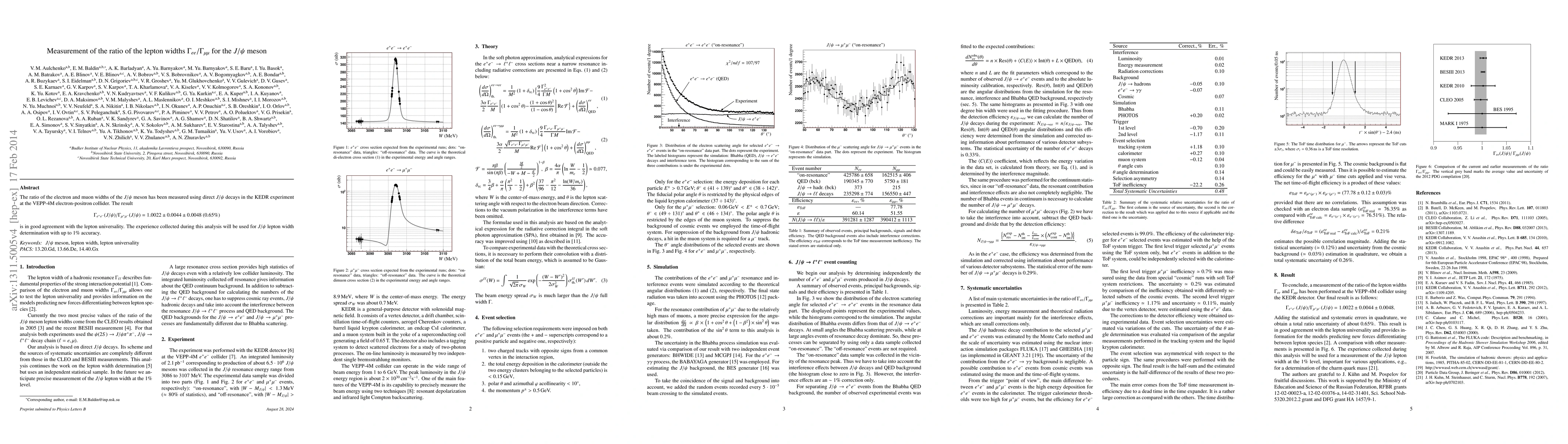 Researchers measured the ratio of electron to muon widths for the $J/ heta$ meson, finding a value in good agreement with lepton universality, which can help determine its lepton width with up to 1% accuracy.