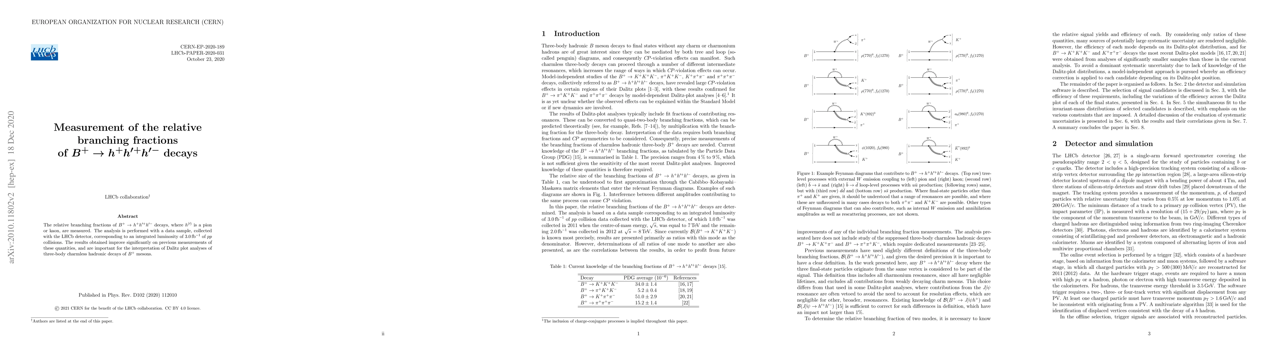 This paper measures the relative branching fractions of $B^+ \to h^+h^{\prime +}h^{\prime -}$ decays, where $h$ and $h^{\prime}$ are pions or kaons, using data from the LHCb detector corresponding to $3.0 {\rm fb}^{-1}$ of $pp$ collisions. The results provide significant improvements over previous measurements, aiding in the interpretation of Dalitz plot analyses for three-body charmless hadronic decays of $B^+$ mesons.