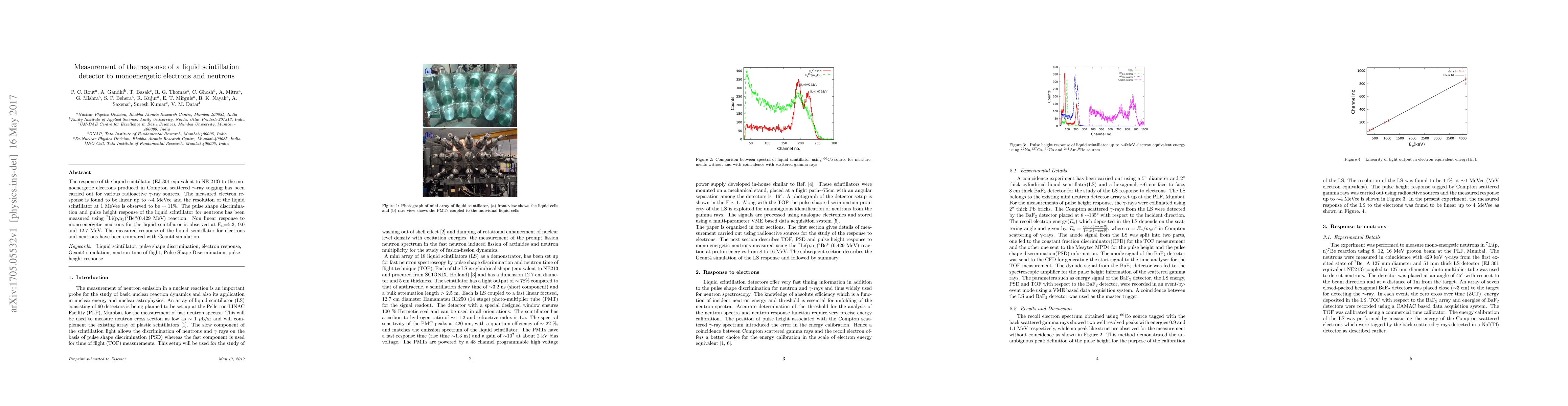 This paper measures the response of a liquid scintillation detector to monoenergetic electrons and neutrons, finding linear electron response up to 4 MeVee with 11% resolution. For neutrons, a nonlinear response is observed at specific energies, and the results are compared with Geant4 simulations.