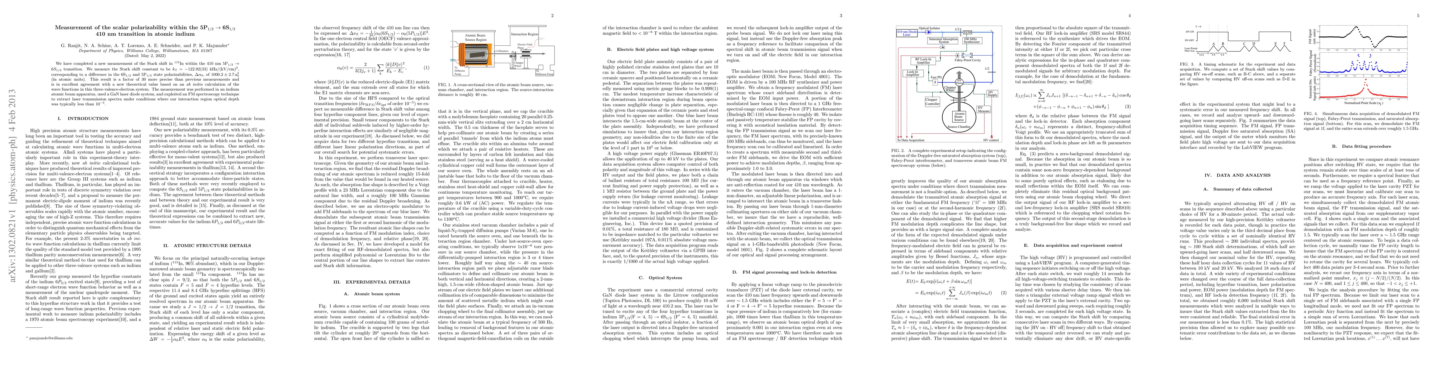 We have completed a new measurement of the Stark shift in 115In within the 410 nm 5P1/2- 6S1/2 transition. We measure the Stark shift constant to be kS= - 122.92(33)kHz/(kV/cm)^2, corresponding to a difference in the 6S1/2 and 5P1/2 state polarizabilities, \Delta\alpha_0, of 1000.2 (2.7) a.u.(in atomic units). This result is a factor of 30 more precise than previous measurements and is in excellent agreement with a new theoretical value based on an ab initio calculation of the wave functions in this three-valence-electron system. The measurement was performed in an indium atomic beam apparatus, used a GaN laser diode system, and exploited an FM spectroscopy technique to extract laser transmission spectra under conditions where our interaction region optical depth was typically less than 10^-3.