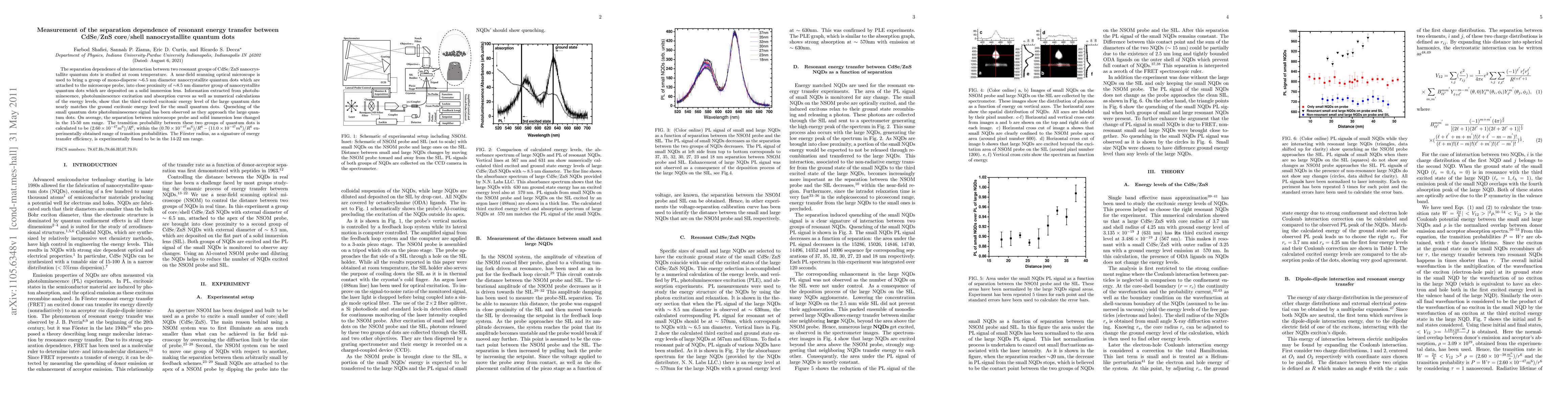 This study investigates the separation-dependent resonant energy transfer between CdSe/ZnS nanocrystallite quantum dots using a near-field scanning optical microscope. The quenching of photoluminescence in small quantum dots as they approach larger ones indicates efficient energy transfer, with a calculated transition probability and Förster radius in the range of (2.60 x 10^-47 m^6)/R^6 and 14-22 nm, respectively.