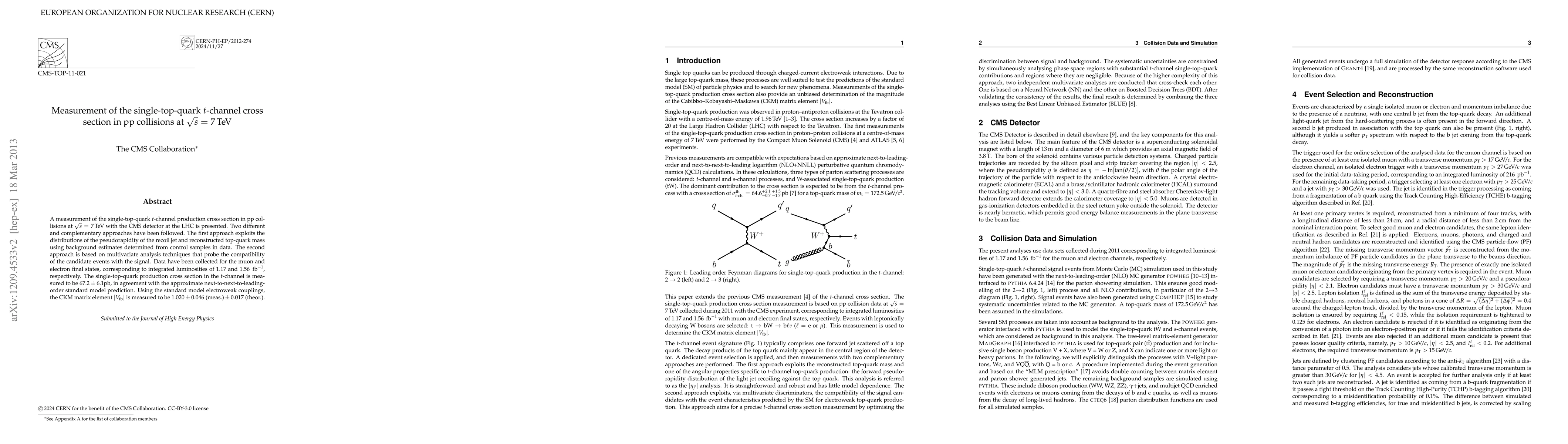 This paper measures the single-top-quark t-channel production cross section in pp collisions at 7 TeV using the CMS detector at the LHC, employing two complementary analysis methods. The result is 67.2 +/- 6.1 pb, consistent with the standard model prediction.