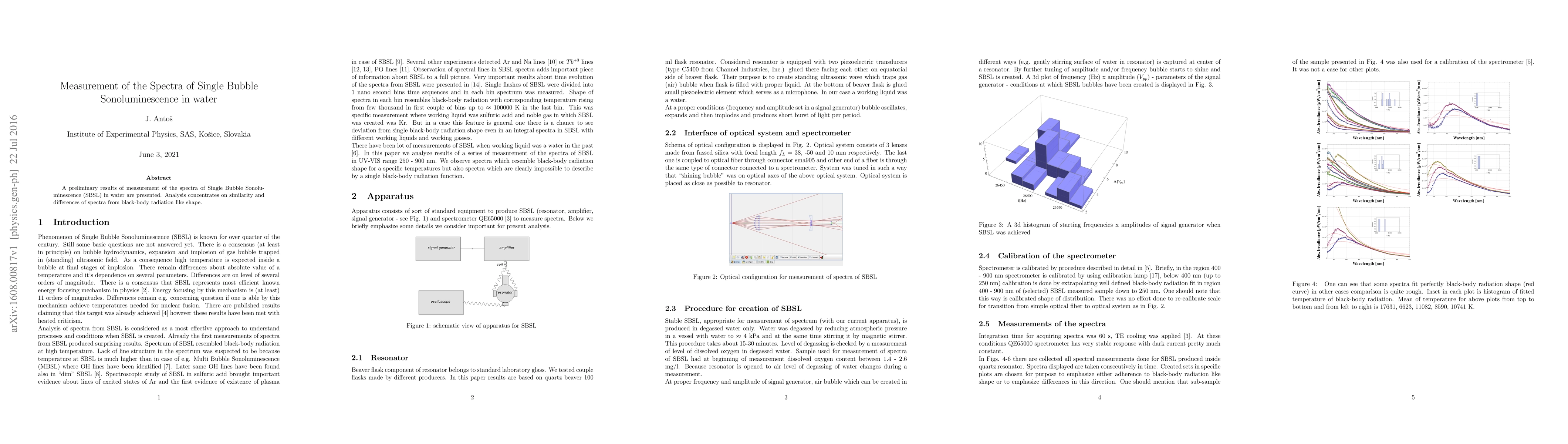 A preliminary results of measurement of the spectra of Single Bubble Sonoluminescence (SBSL) in water are presented. Analysis concentrates on similarity and differences of spectra from black-body radiation like shape.