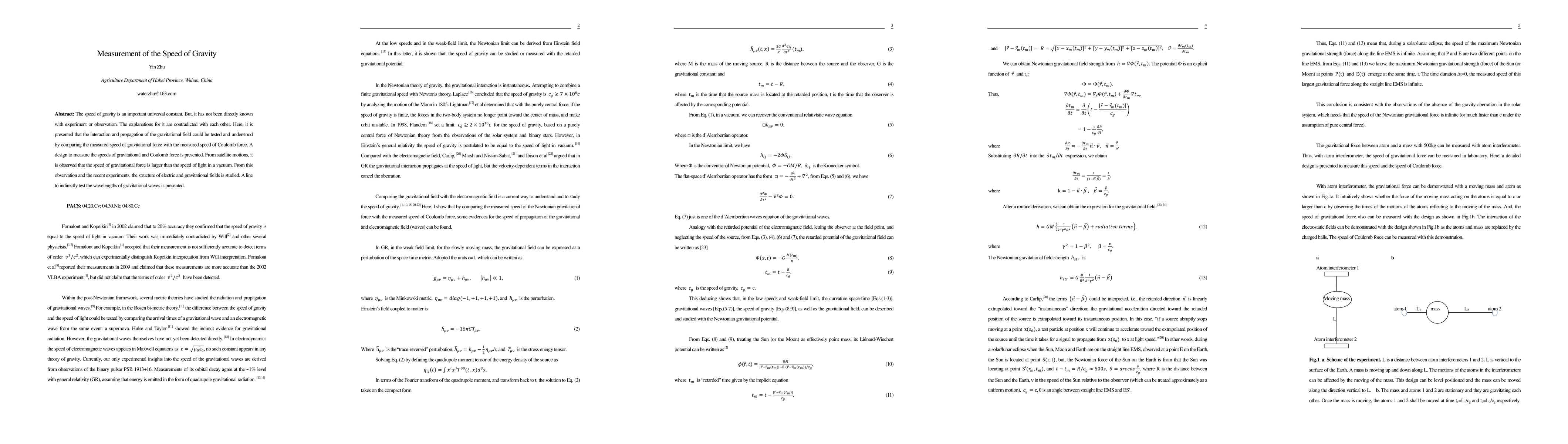 The speed of gravity is an important universal constant. But, it has not been directly known with experiment or observation. The explanations for it are contradicted with each other. Here, it is presented that the interaction and propagation of the gravitational field could be tested and understood by comparing the measured speed of gravitational force with the measured speed of Coulomb force. A design to measure the speeds of gravitational and Coulomb force is presented. From satellite motions, it is observed that the speed of gravitational force is larger than the speed of light in a vacuum. From this observation and the recent experiments, the structure of electric and gravitational fields is studied. A line to indirectly test the wavelengths of gravitational waves is presented.