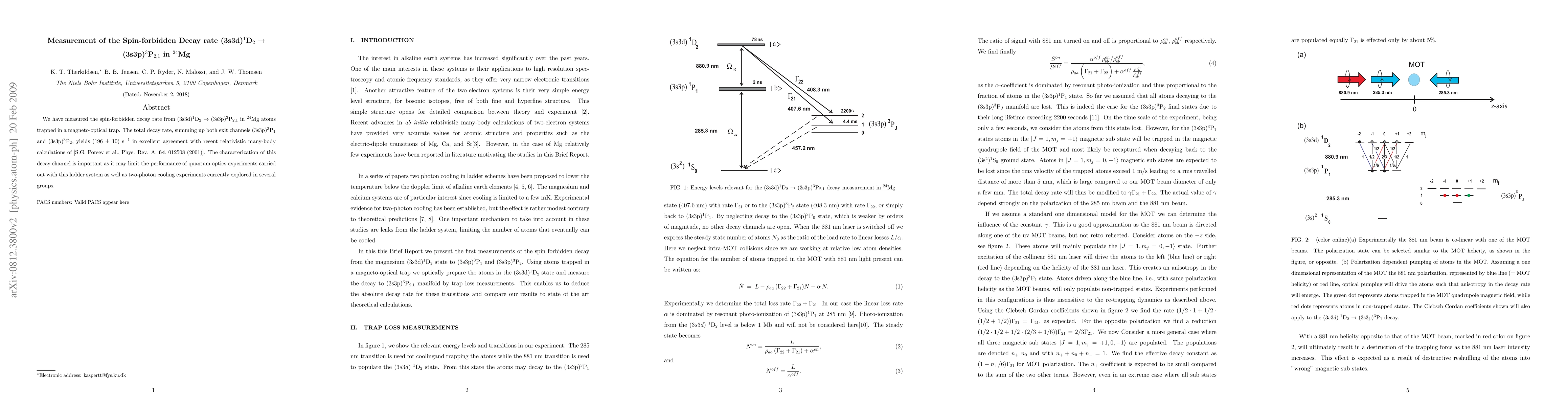 We have measured the spin-forbidden decay rate from (3s3d)$^{1}$D$_{2}$ $\to$ (3s3p)$^{3}$P$_{2,1}$ in $^{24}$Mg atoms trapped in a magneto-optical trap. The total decay rate, summing up both exit channels (3s3p)$^{3}$P$_{1}$ and (3s3p)$^{3}$P$_{2}$, yields (196 $\pm$ 10) s$^{-1}$ in excellent agreement with resent relativistic many-body calculations of [S.G. Porsev et al., Phys. Rev. A. \textbf{64}, 012508 (2001)]. The characterization of this decay channel is important as it may limit the performance of quantum optics experiments carried out with this ladder system as well as two-photon cooling experiments currently explored in several groups.