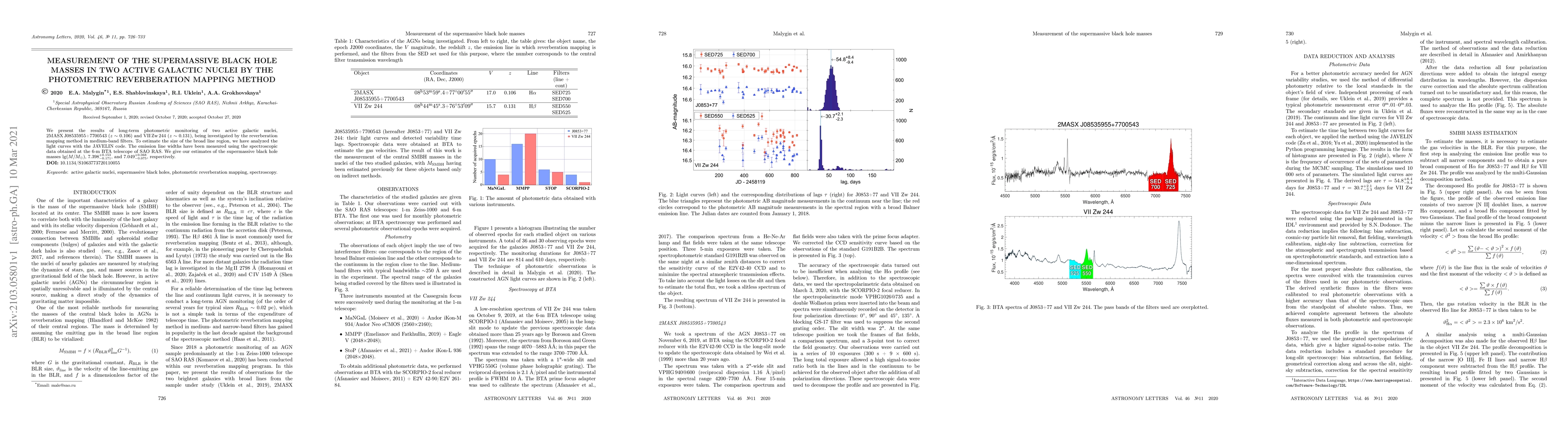 This paper reports the supermassive black hole masses of two active galactic nuclei, 2MASX J08535955+7700543 and VII Zw 244, estimated via photometric reverberation mapping. The study utilized medium-band filters and spectroscopic data to determine the black hole masses as $7.398_{-0.171}^{+0.153}$ and $7.049_{-0.075}^{+0.068}$ solar masses, respectively.