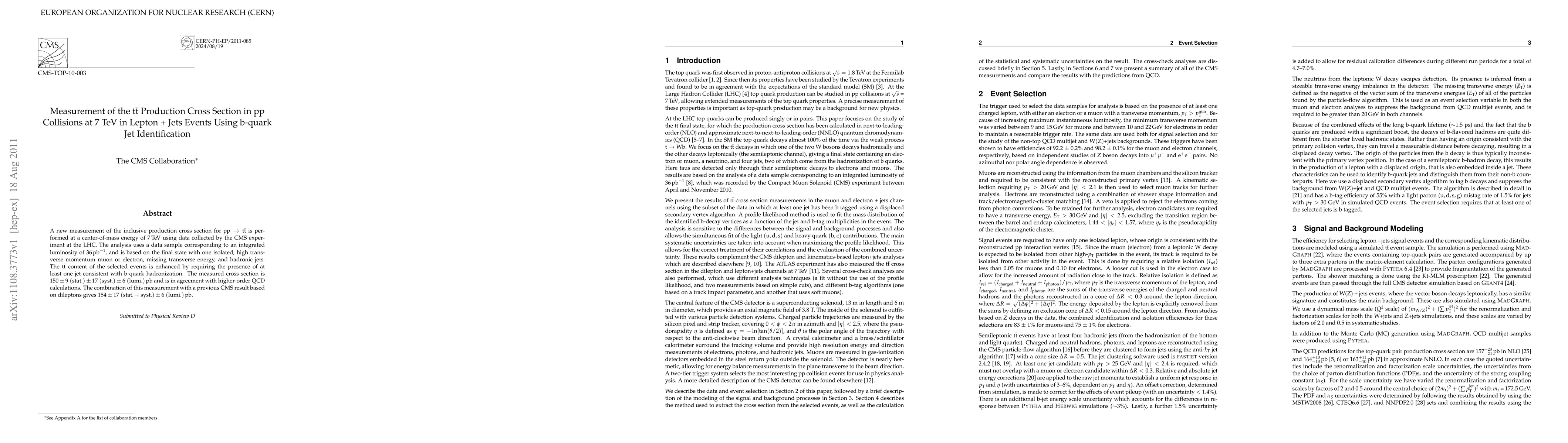Researchers measured the t t-bar production cross section in pp collisions at 7 TeV, finding a value of 150 pb with an agreement with higher-order QCD calculations.