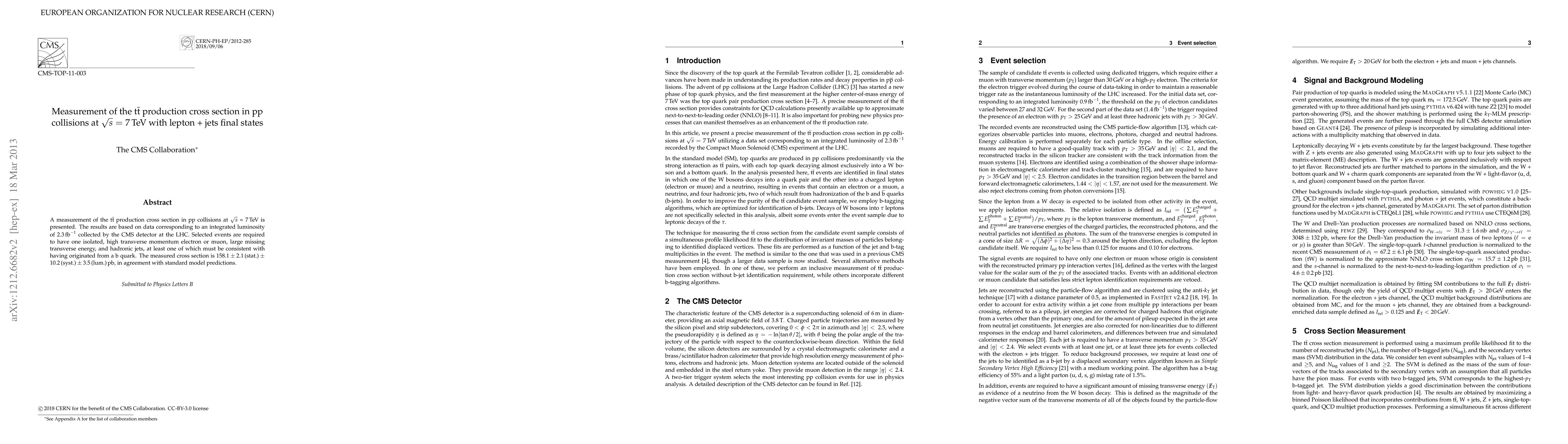 This paper reports a measurement of the tt-bar production cross section in proton-proton collisions at 7 TeV using the CMS detector at the LHC, finding a value of 158.1 ± 2.1 pb, consistent with standard model predictions. The analysis focuses on events with one high-momentum lepton and large missing transverse energy.