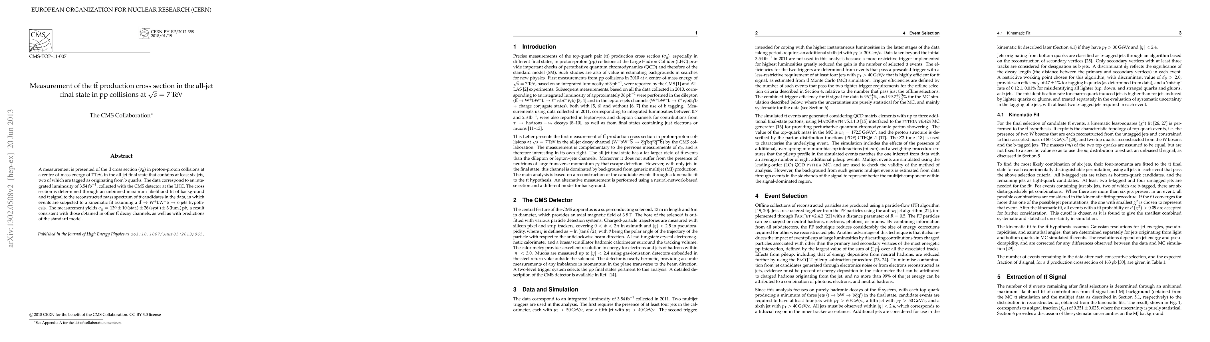 This paper measures the tt-bar production cross section in proton-proton collisions at 7 TeV using the all-jet final state with the CMS detector at the LHC, yielding a cross section of 139 ± 10 (stat.) ± 26 (syst.) ± 3 (lum.) pb, consistent with standard model predictions.