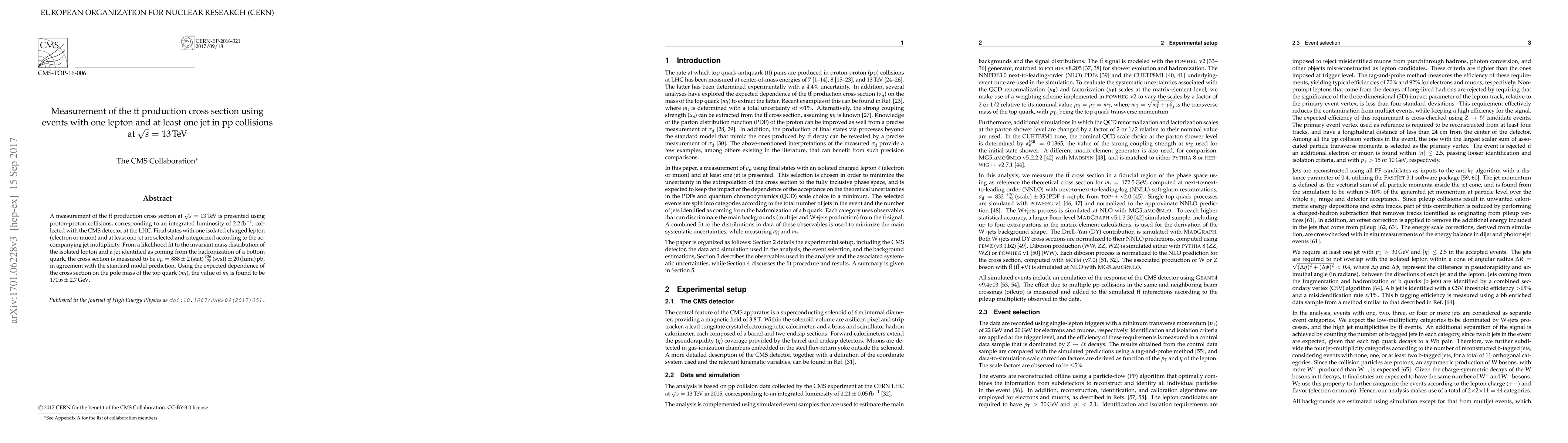 A measurement of the t t-bar production cross section at sqrt(s) = 13 TeV is presented using proton-proton collisions, corresponding to an integrated luminosity of 2.2 inverse femtobarns, collected with the CMS detector at the LHC. Final states with one isolated charged lepton (electron or muon) and at least one jet are selected and categorized according to the accompanying jet multiplicity. From a likelihood fit to the invariant mass distribution of the isolated lepton and a jet identified as coming from the hadronization of a bottom quark, the cross section is measured to be sigma(t t-bar) = 888 +/- 2 (stat) +26 -28 (syst) +/- 20 (lumi) pb, in agreement with the standard model prediction. Using the expected dependence of the cross section on the pole mass of the top quark (m[t]), the value of m[t] is found to be 170.6 +/- 2.7 GeV.