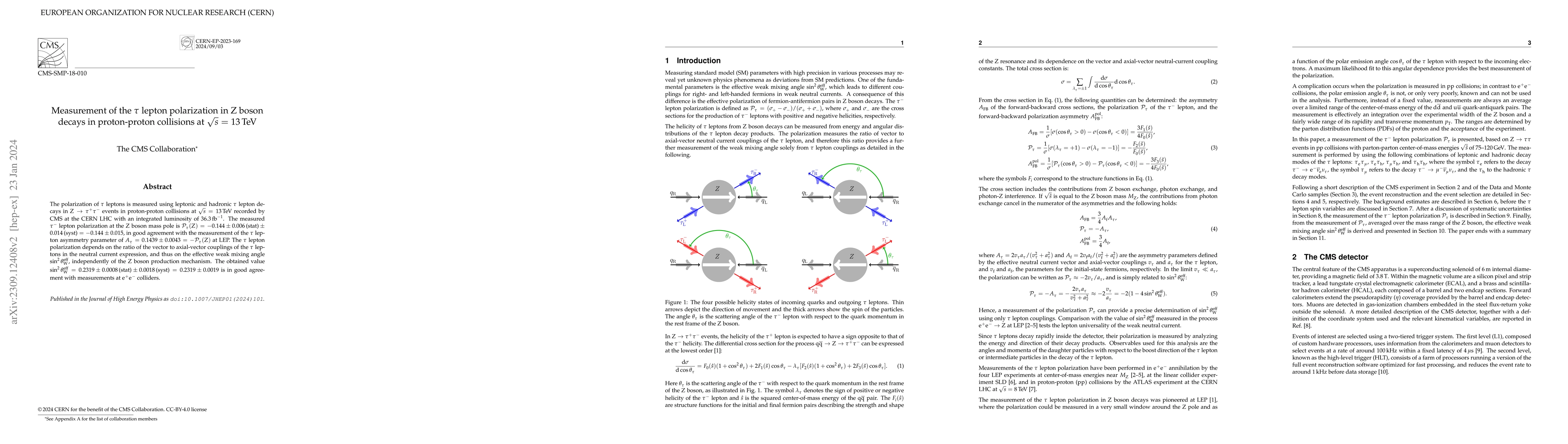 This paper measures the polarization of $\tau$ leptons in Z boson decays at 13 TeV proton-proton collisions using the CMS detector at the LHC, finding $\mathcal{P}_{\tau}$(Z) = -0.144 $\pm$ 0.015, consistent with LEP measurements. The result also provides an independent determination of $\sin^{2}\theta_\mathrm{W}^{\text{eff}}$ = 0.2319 $\pm$ 0.0019, aligning with e$^+$e$^-$ collider measurements.