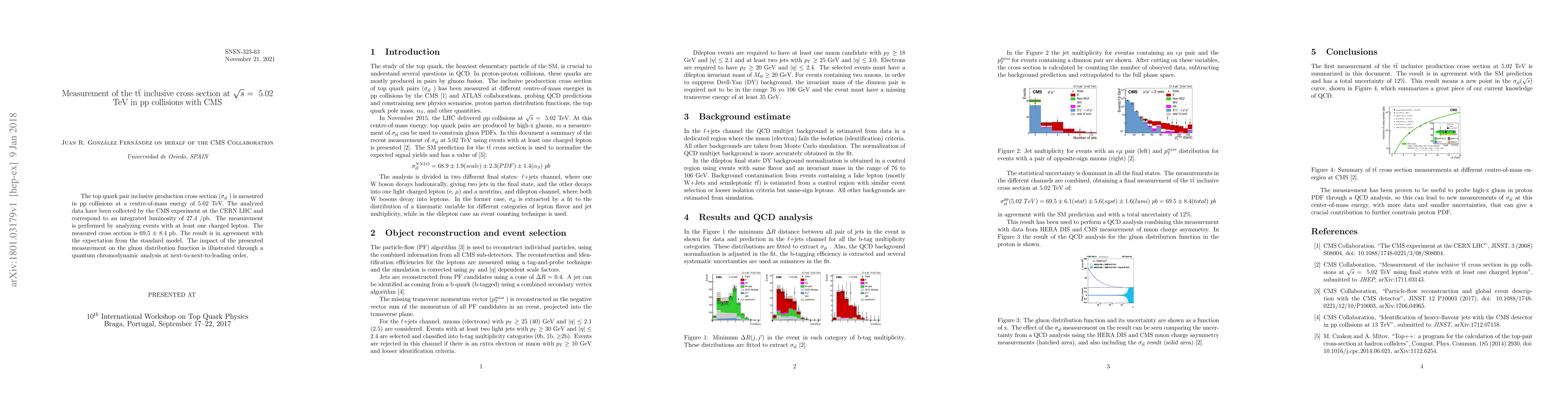 The top quark pair production $\sigma_{t\bar{t}}$ is measured in pp collisions at a center-of-mass energy of 5.02 TeV. The analyzed data have been collected by the CMS experiment at the CERN LHC and correspond to an integrated luminosity of 27.4 /pb. The measurement is performed by analyzing events with at least one charged lepton. The measured cross section is 69.5 $\pm$ 8.4 pb. The result is in agreement with the expectation from the standard model. The impact of the presented measurement on the gluon distribution function is illustrated through a quantum chromodynamic analysis at next-to-next-to-leading order.