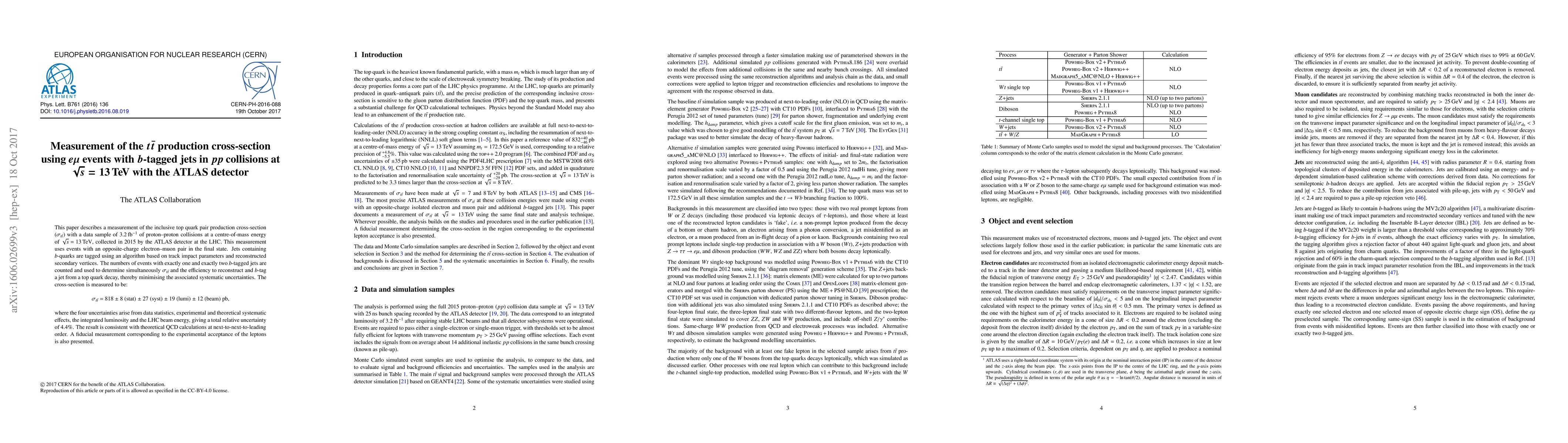 This paper measures the top quark pair production cross-section using $e\mu$ events with b-tagged jets in 13 TeV proton-proton collisions at the LHC, yielding $\sigma_{t\bar{t}}$= 818 $\pm$ 8 (stat) $\pm$ 27 (syst) $\pm$ 19 (lumi) $\pm$ 12 (beam) pb, consistent with next-to-next-to-leading order QCD calculations.