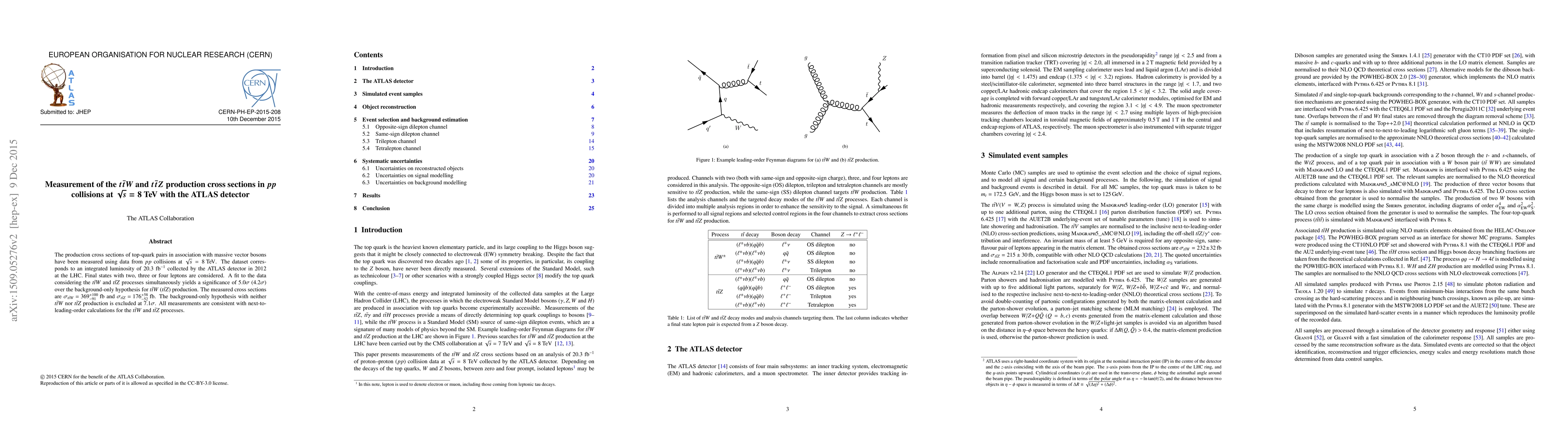 The ATLAS detector measured the $t\bar{t}W$ and $t\bar{t}Z$ production cross sections in $pp$ collisions at $\sqrt{s} = 8$ TeV, finding $\sigma_{t\bar{t}W} = 369^{+100}_{-91}$ fb and $\sigma_{t\bar{t}Z} = 176^{+58}_{-52}$ fb, with a $5.0\sigma$ significance for $t\bar{t}W$ and $4.2\sigma$ for $t\bar{t}Z$.