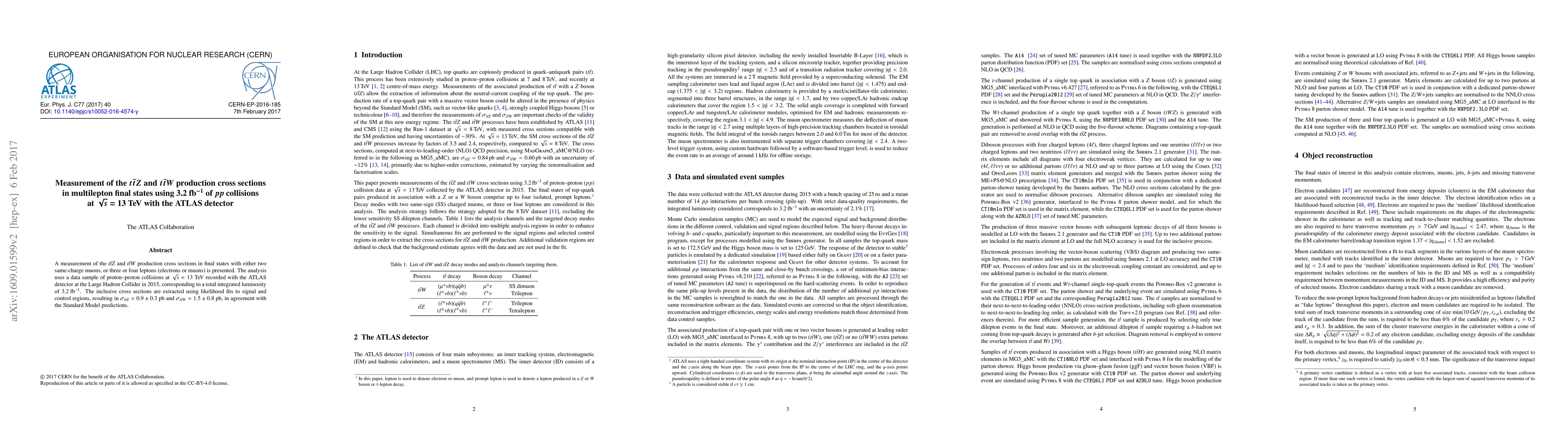 This study measures the $t\bar{t}Z$ and $t\bar{t}W$ production cross sections in multilepton final states using 3.2 fb$^{-1}$ of $pp$ collisions at $\sqrt{s} = 13$ TeV with the ATLAS detector, finding $\sigma_{t\bar{t}Z} = 0.9 \pm 0.3$ pb and $\sigma_{t\bar{t}W} = 1.5 \pm 0.8$ pb, consistent with Standard Model predictions.