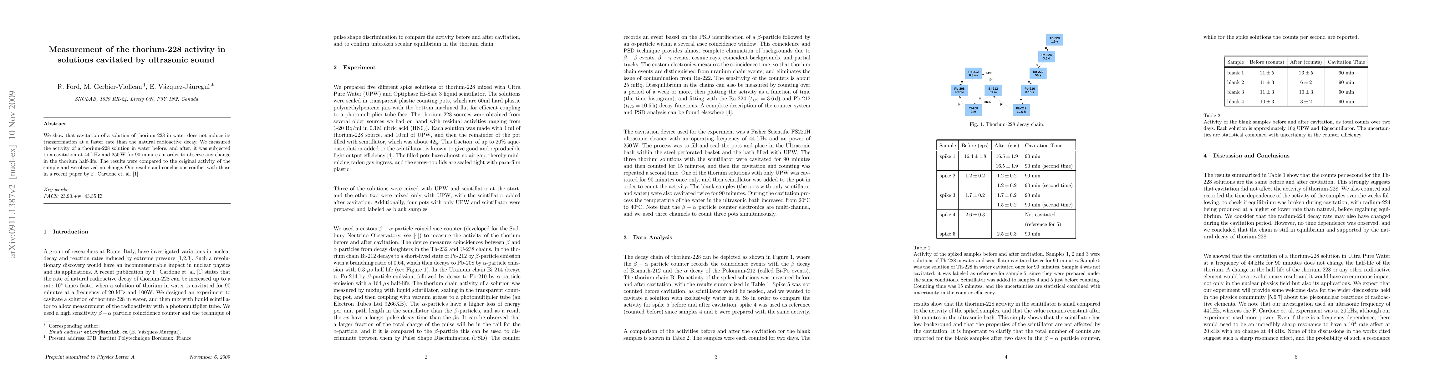 This study investigates the effect of ultrasonic cavitation on the activity of thorium-228 in water, finding no change in its decay rate compared to natural radioactive decay. Contrary to a recent conflicting paper, the cavitation process did not accelerate thorium-228 transformation.
