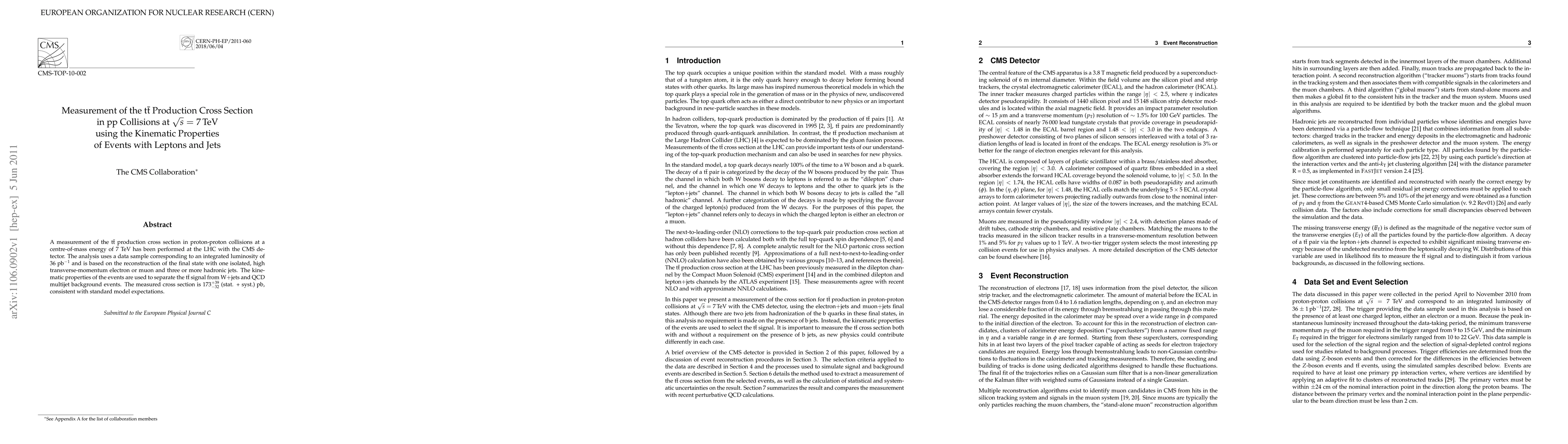A measurement of the top-antitop production cross section in proton-proton collisions at a centre-of-mass energy of 7 TeV has been performed at the LHC with the CMS detector. The analysis uses a data sample corresponding to an integrated luminosity of 36 inverse picobarns and is based on the reconstruction of the final state with one isolated, high transverse-momentum electron or muon and three or more hadronic jets. The kinematic properties of the events are used to separate the top-antitop signal from W+jets and QCD multijet background events. The measured cross section is 173 + 39 - 32 (stat. + syst.) pb, consistent with standard model expectations.