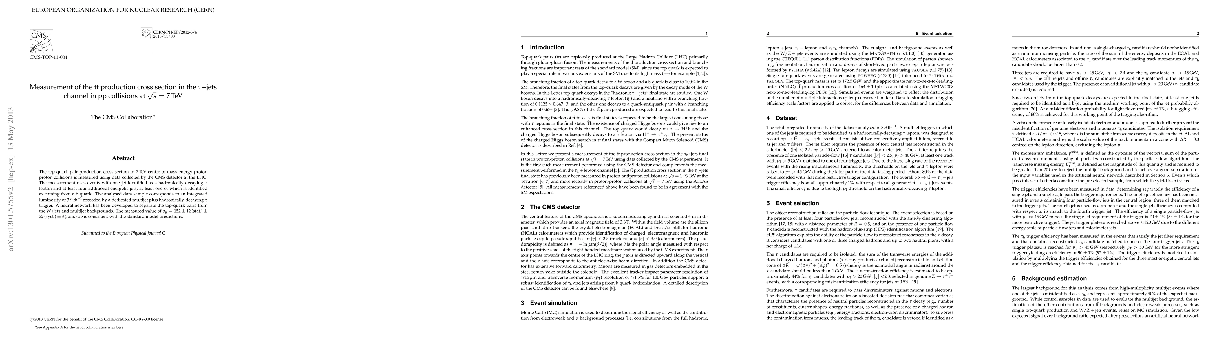 The top-quark pair production cross section in 7 TeV center-of-mass energy proton-proton collisions is measured using data collected by the CMS detector at the LHC. The measurement uses events with one jet identified as a hadronically decaying tau lepton and at least four additional energetic jets, at least one of which is identified as coming from a b quark. The analyzed data sample corresponds to an integrated luminosity of 3.9 inverse femtobarns recorded by a dedicated multijet plus hadronically decaying tau trigger. A neural network has been developed to separate the top-quark pairs from the W+jets and multijet backgrounds. The measured value of sigma(ttbar) = 152 +/- 12 (stat.) +/- 32 (syst.) +/- 3 (lum.) pb is consistent with the standard model predictions.