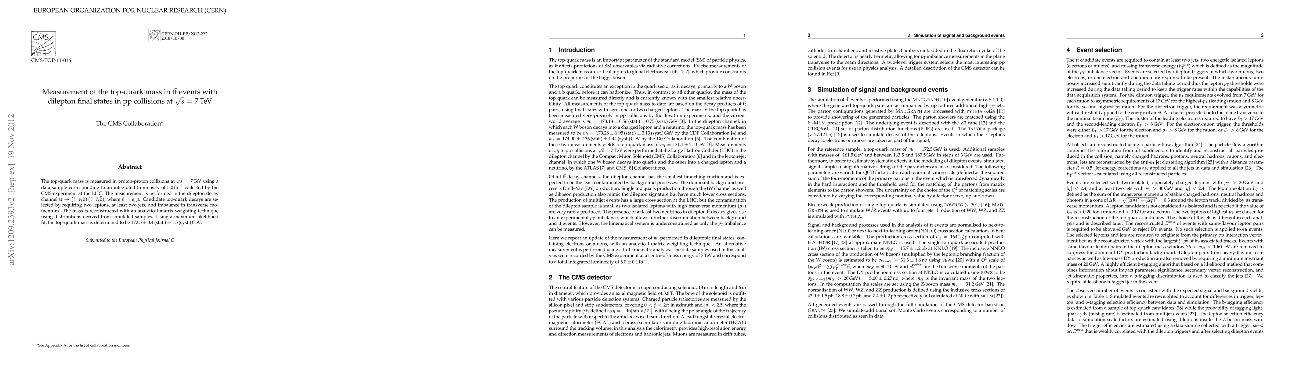 This study measures the top-quark mass in proton-proton collisions at 7 TeV using CMS data from the LHC, focusing on the dilepton decay channel. The top-quark mass is determined to be 172.5 ± 0.4 (stat) ± 1.5 (syst) GeV using an analytical matrix weighting technique.