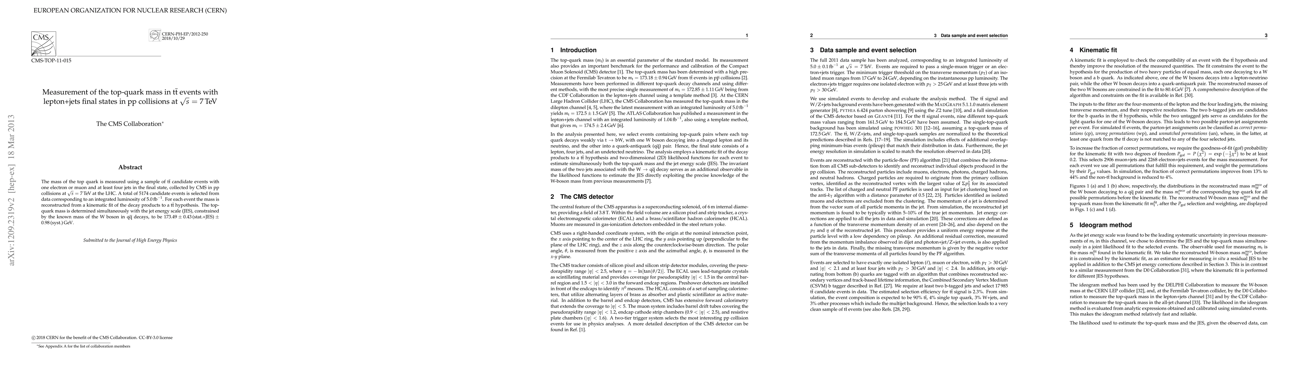The CMS collaboration measures the top-quark mass in t t-bar events with lepton+jets final states at 7 TeV, determining it to be 173.49 ± 0.43 (stat.+JES) ± 0.98 (syst.) GeV. The analysis uses a sample of 5174 events with one electron or muon and at least four jets.